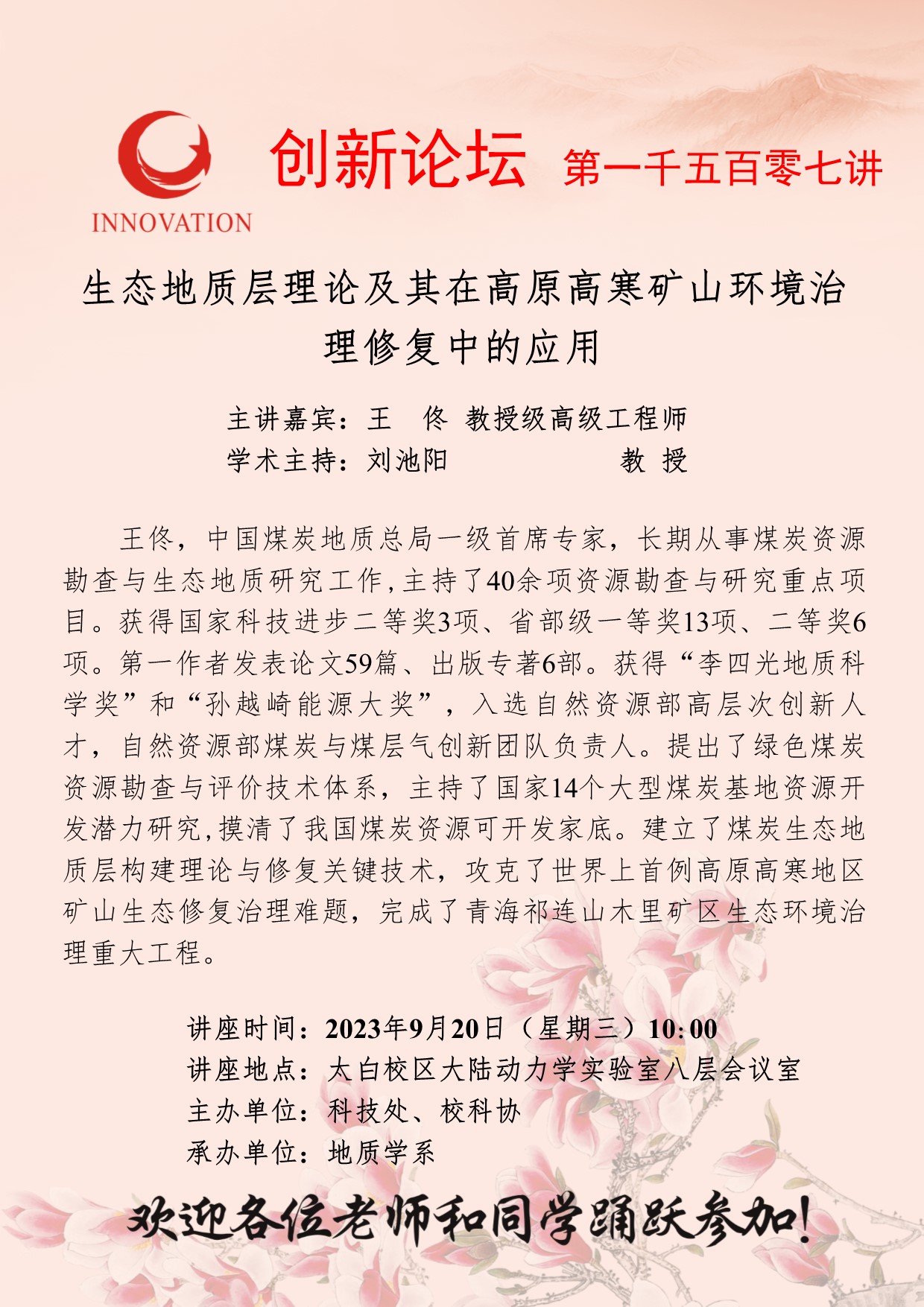 王佟 教授级高级工程师 BB平台创新论坛第一千五百零七讲:生态地质层理论及其在高原高寒矿山环境治理修复中的应用 讲座时间 2023年9月20日(星期三)10:00 讲座地点 太白校区大陆动力学实验室八层会议室 讲座人介绍 王佟 教授级高级工程师 讲座内容