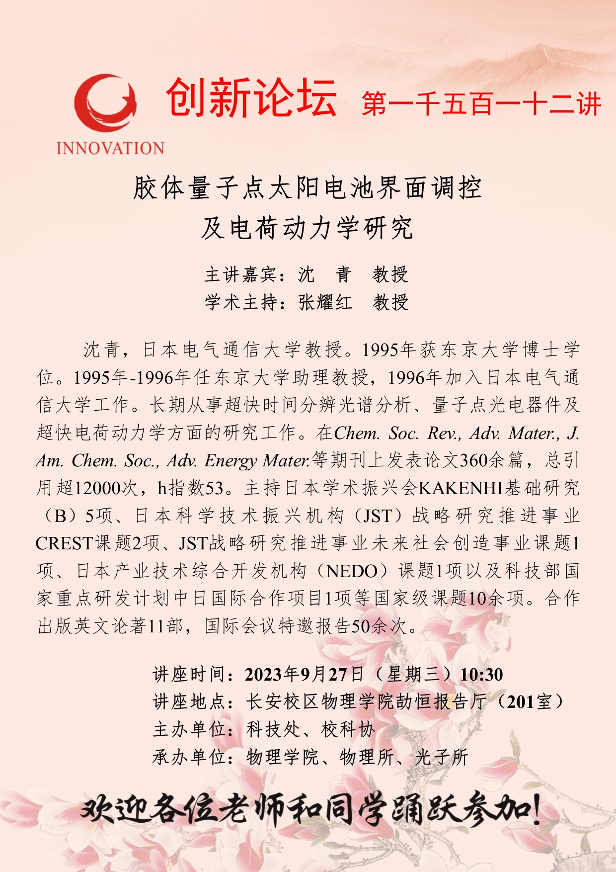 沈青 教授 BB平台创新论坛第一千五百一十二讲:胶体量子点太阳电池界面调控及电荷动力学研究 讲座时间 2023年9月27日(星期三)10:30 讲座地点 长安校区物理学院劼恒报告厅(201室) 讲座人介绍 沈青 教授 讲座内容