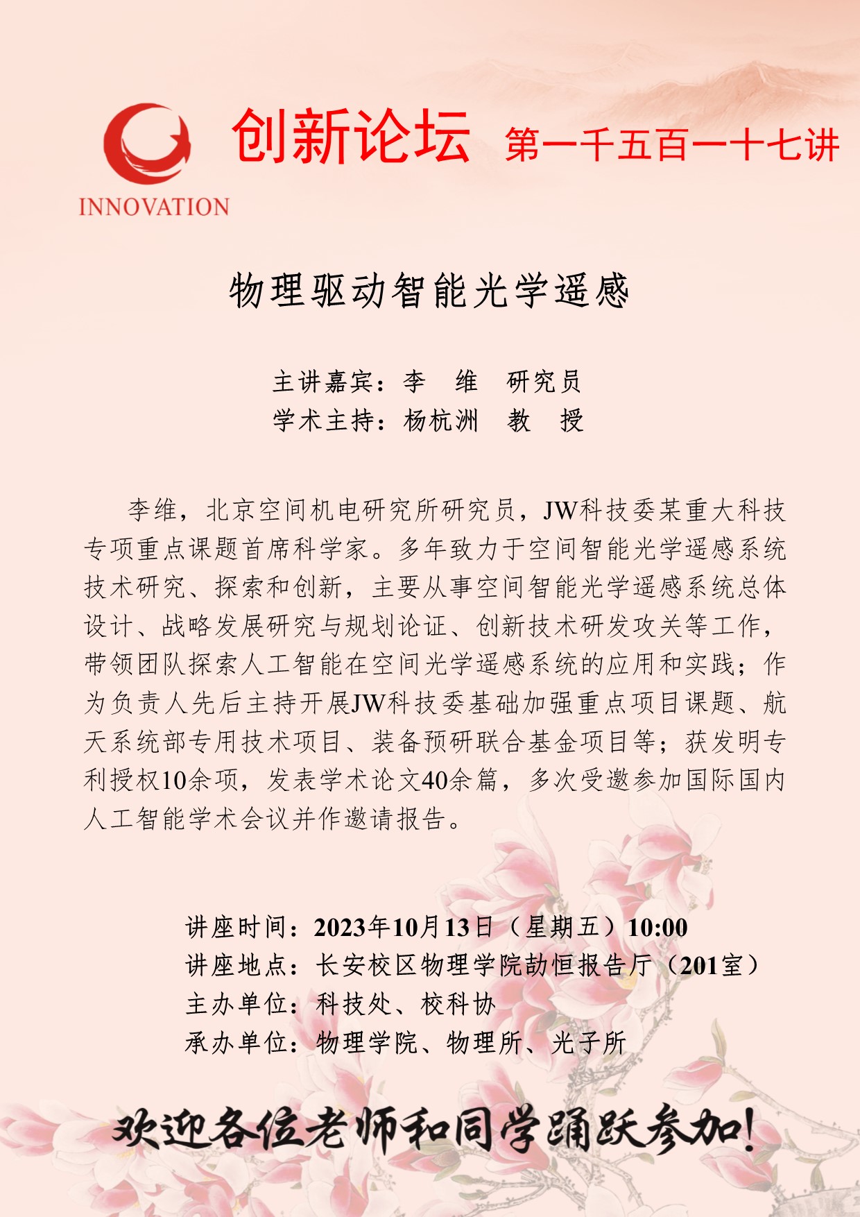 李维 研究员 BB平台创新论坛第一千五百一十七讲:物理驱动智能光学遥感 讲座时间 2023年10月13日(星期五)10:00 讲座地点 长安校区物理学院劼恒报告厅(201室) 讲座人介绍 李维 研究员 讲座内容