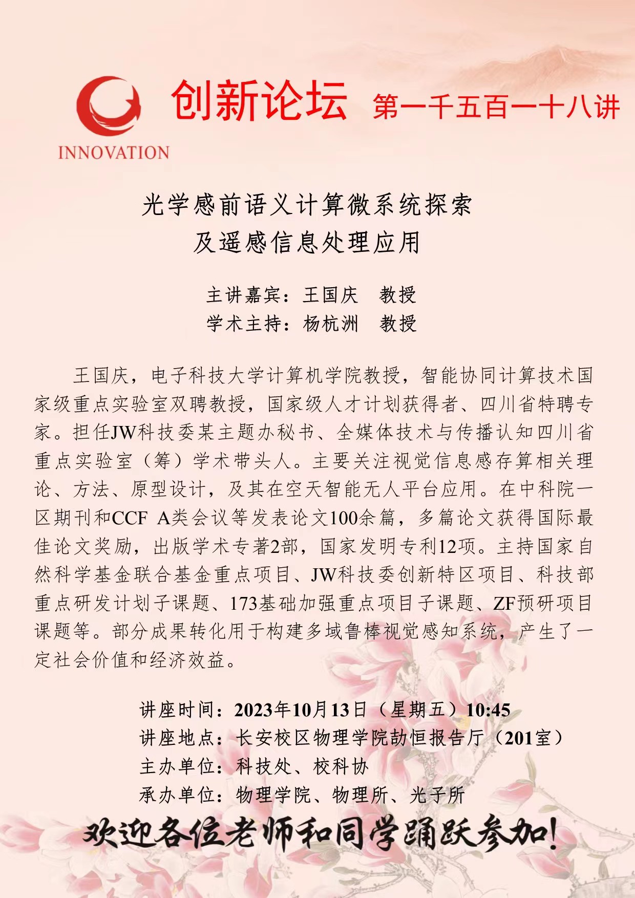 王国庆 教授 BB平台创新论坛第一千五百一十八讲:光学感前语义计算微系统探索及遥感信息处理应用 讲座时间 2023年10月13日(星期五)10:45 讲座地点 长安校区物理学院劼恒报告厅(201室) 讲座人介绍 王国庆 教授 讲座内容