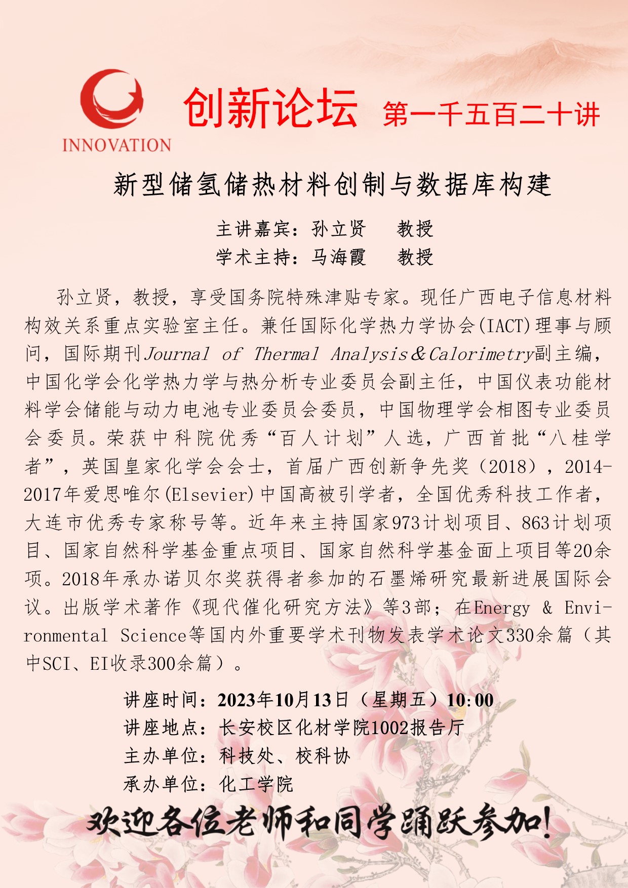 孙立贤 教授 BB平台创新论坛第一千五百二十讲:新型储氢储热材料创制与数据库构建 讲座时间 2023年10月13日(星期五)10:00 讲座地点 长安校区化材学院1002报告厅 讲座人介绍 孙立贤 教授 讲座内容