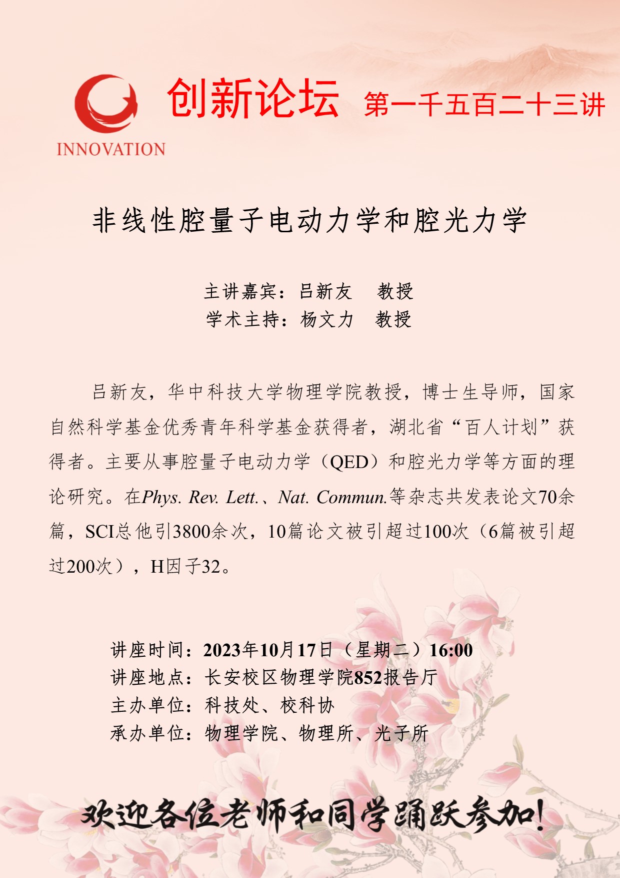 吕新友 教授 BB平台创新论坛第一千五百二十三讲:非线性腔量子电动力学和腔光力学 讲座时间 2023年10月17日(星期二)16:00 讲座地点 长安校区物理学院852报告厅 讲座人介绍 吕新友 教授 讲座内容