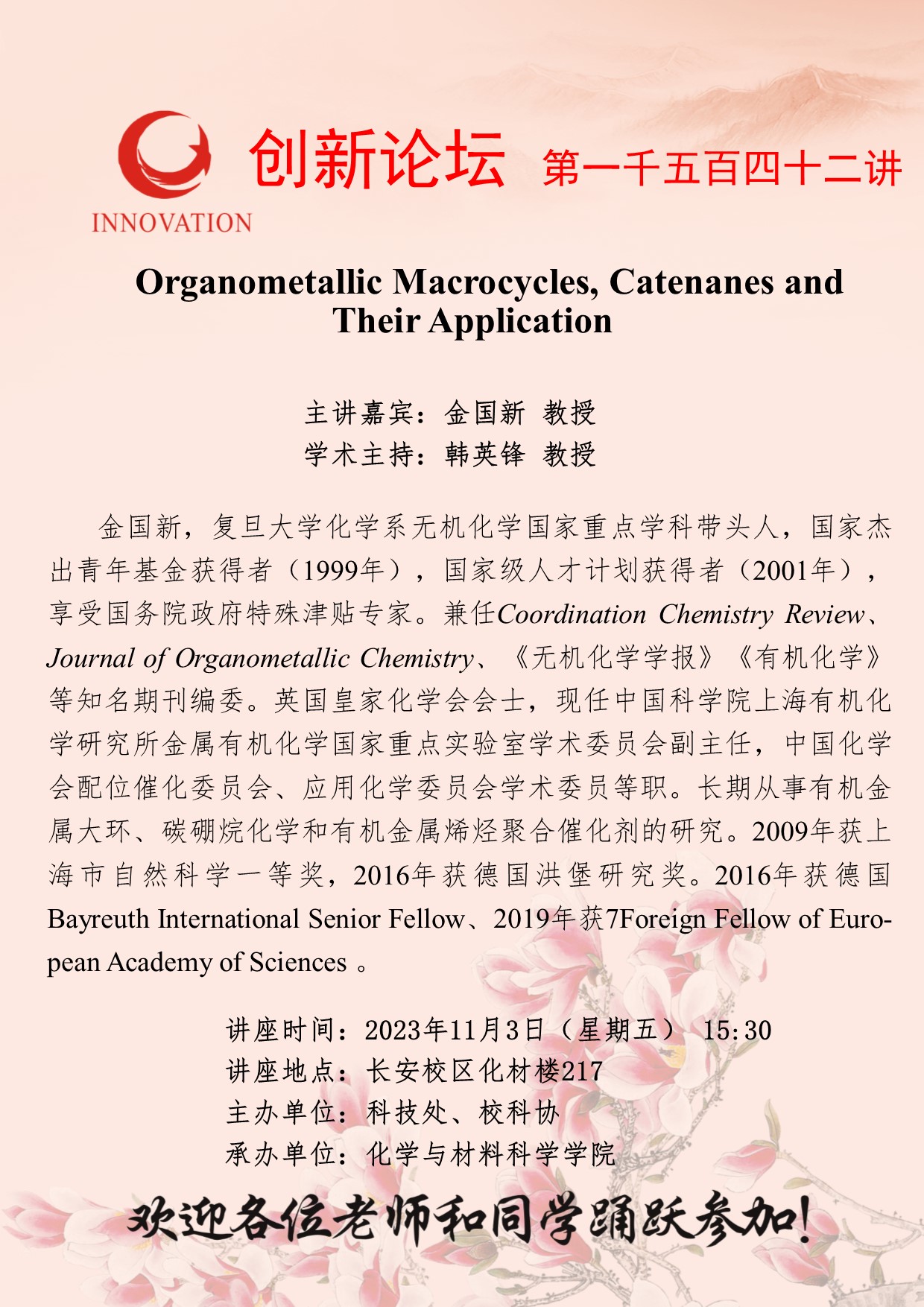 金国新 教授 BB平台创新论坛第一千五百四十二讲:Organometallic Macrocycles, Catenanes and Their Application 讲座时间 2023年11月3日(星期五) 15:30 讲座地点 长安校区化材楼217 讲座人介绍 金国新 教授 讲座内容