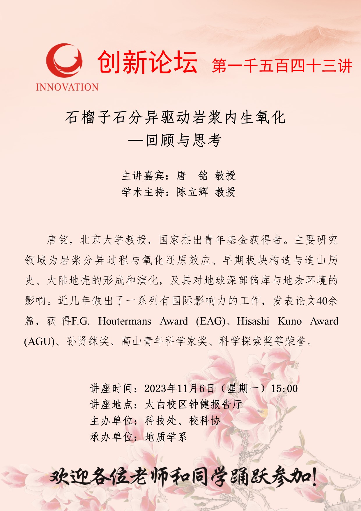 唐铭 教授 BB平台创新论坛第一千五百四十三讲:石榴子石分异驱动岩浆内生氧化—回顾与思考 讲座时间 2023年11月6日(星期一)15:00 讲座地点 太白校区钟健报告厅 讲座人介绍 唐铭 教授 讲座内容