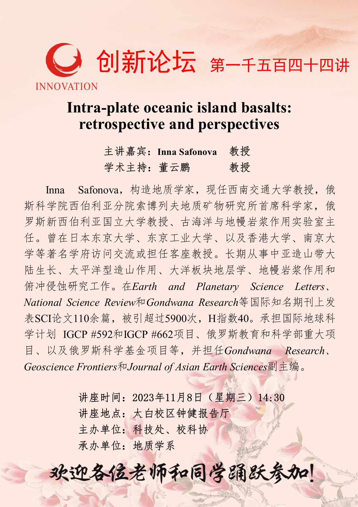 Inna Safonova 教授 BB平台创新论坛第一千五百四十四讲:Intra-plate oceanic island basalts: retrospective and perspectives 讲座时间 2023年11月8日(星期三)14:30 讲座地点 太白校区钟健报告厅 讲座人介绍 Inna Safonova 教授 讲座内容