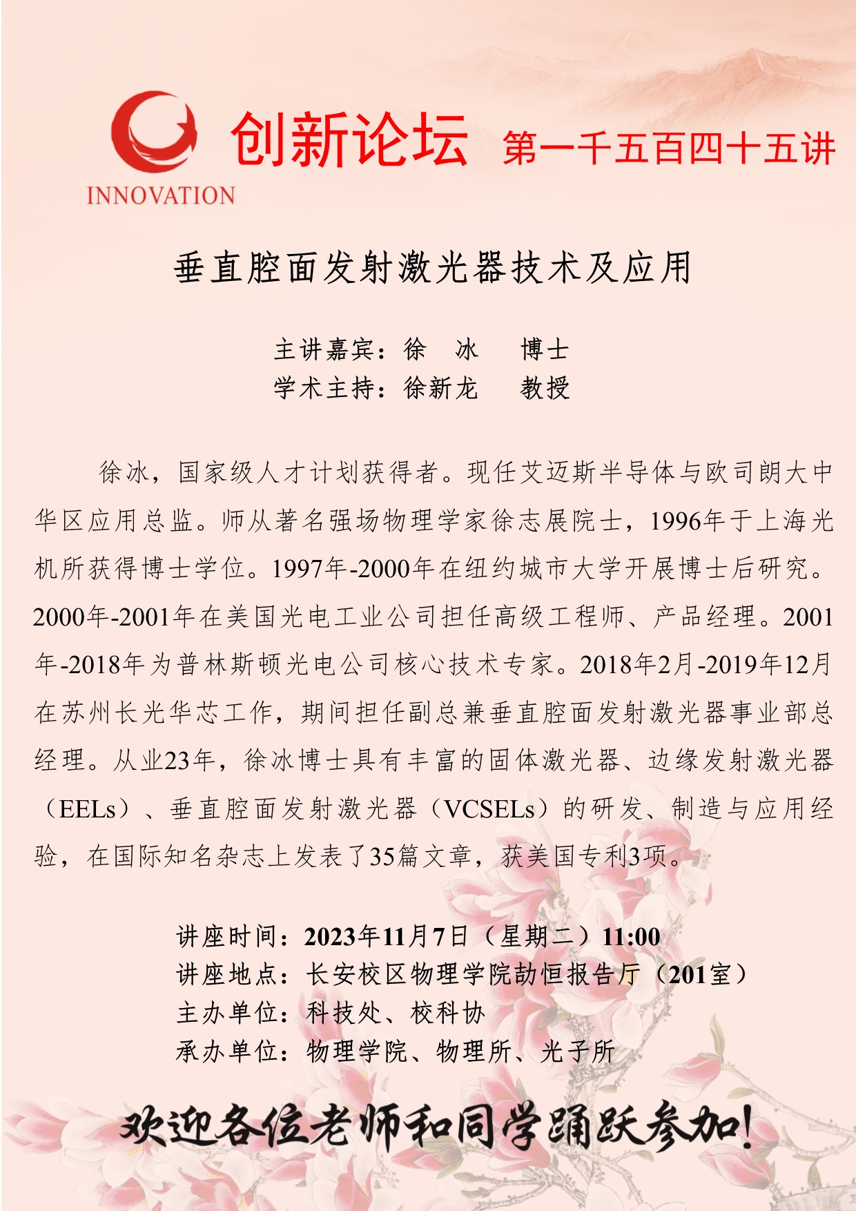 徐冰 博士 BB平台创新论坛第一千五百四十五讲:垂直腔面发射激光器技术及应用 讲座时间 2023年11月7日(星期二)11:00 讲座地点 长安校区物理学院劼恒报告厅(201室) 讲座人介绍 徐冰 博士 讲座内容