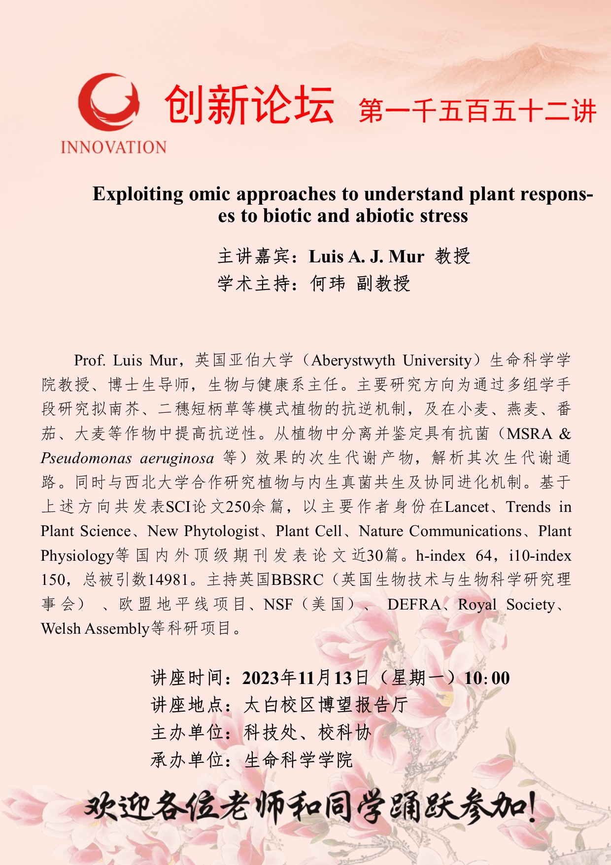 Luis A. J. Mur 教授 BB平台创新论坛第一千五百五十二讲:Exploiting omic approaches to understand plant responses to biotic and abiotic stress 讲座时间 2023年11月13日(星期一)10:00 讲座地点 太白校区博望报告厅 讲座人介绍 Luis A. J. Mur 教授 讲座内容