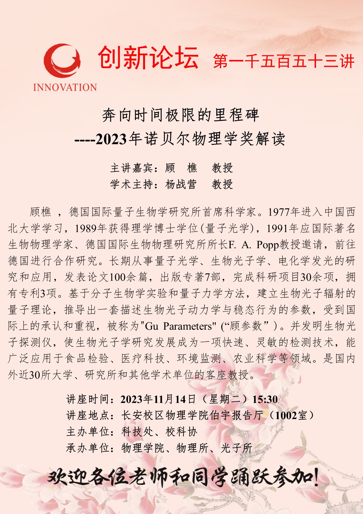 顾樵 教授 BB平台创新论坛第一千五百五十三讲:奔向时间极限的里程碑----2023年诺贝尔物理学奖解读 讲座时间 2023年11月14日(星期二)15:30 讲座地点 长安校区物理学院伯宇报告厅(1002室) 讲座人介绍 顾樵 教授 讲座内容