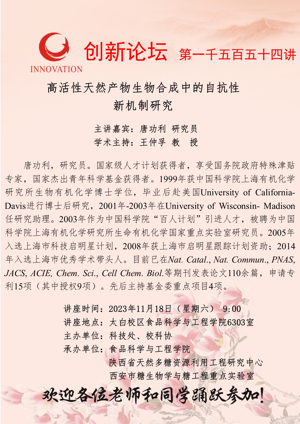 唐功利 研究员 BB平台创新论坛第一千五百五十四讲:高活性天然产物生物合成中的自抗性 新机制研究 讲座时间 2023年11月18日(星期六) 9:00 讲座地点 太白校区食品科学与工程学院6303室 讲座人介绍 唐功利 研究员 讲座内容