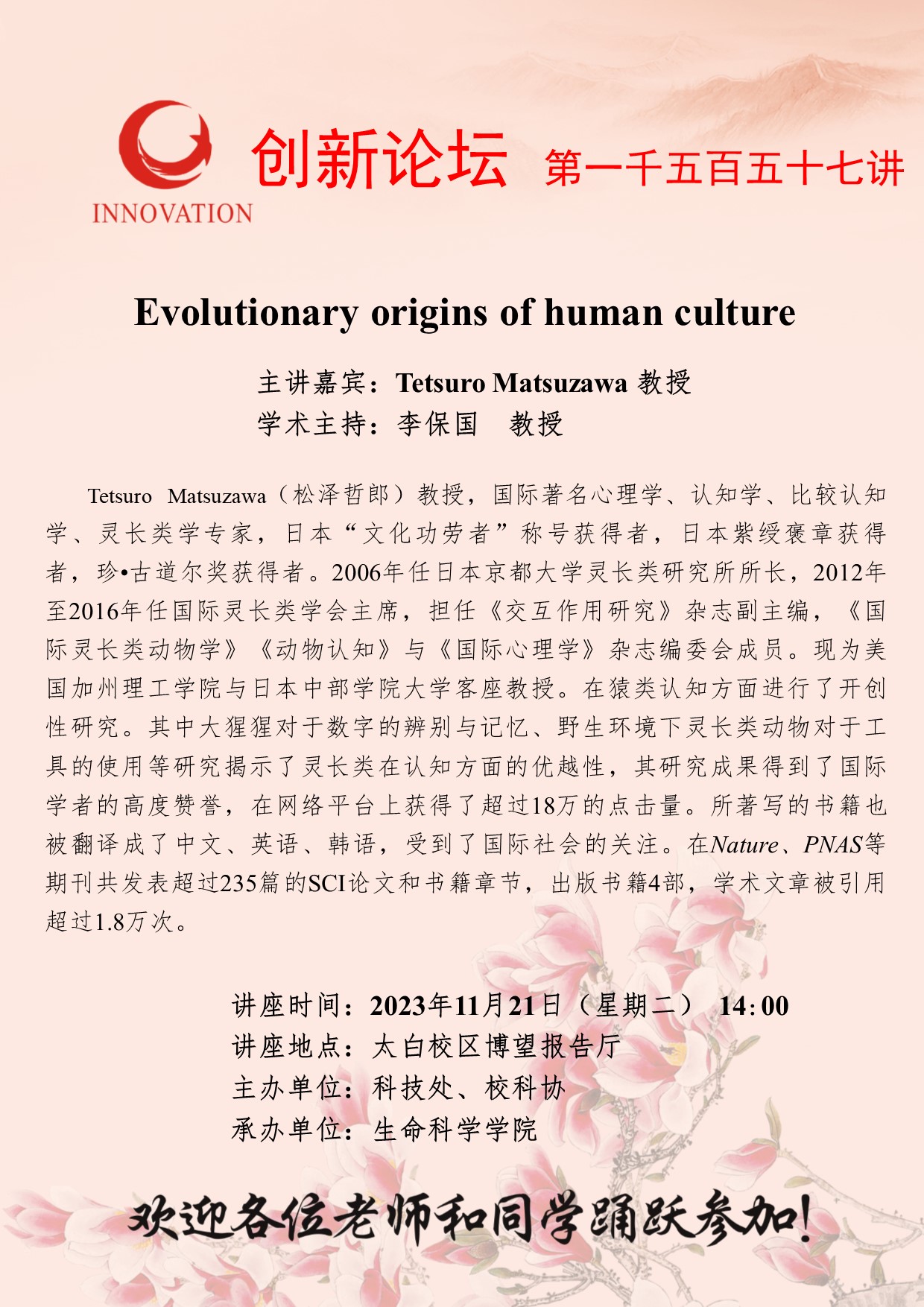 Tetsuro Matsuzawa 教授 BB平台创新论坛第一千五百五十七讲:Evolutionary origins of human culture 讲座时间 2023年11月21日(星期二) 14:00 讲座地点 太白校区博望报告厅 讲座人介绍 Tetsuro Matsuzawa 教授 讲座内容