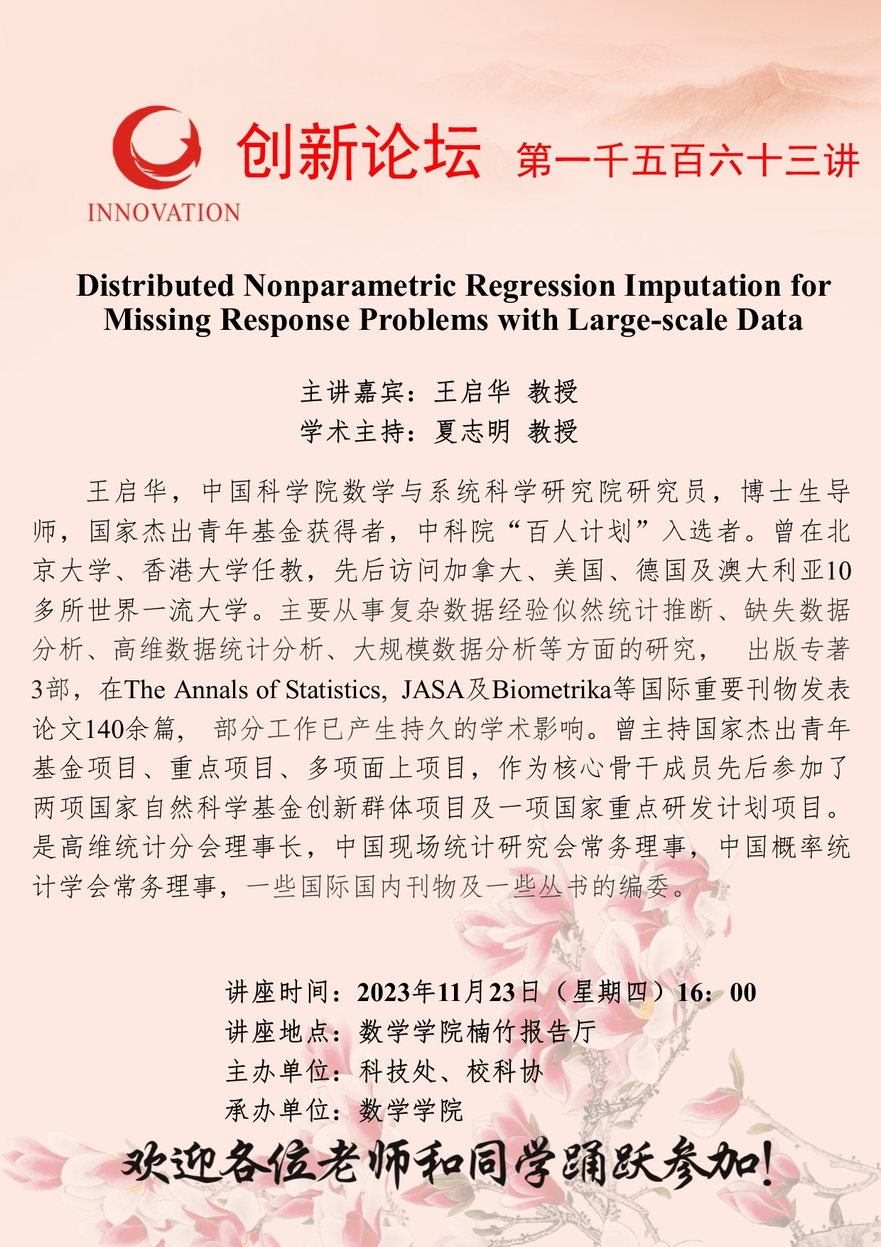 王启华 教授 BB平台创新论坛第一千五百六十三讲:Distributed Nonparametric Regression Imputation for Missing Response Problems with Large-scale Data 讲座时间 2023年11月23日(周四)16:00 讲座地点 数学学院楠竹报告厅 讲座人介绍 王启华 教授 讲座内容