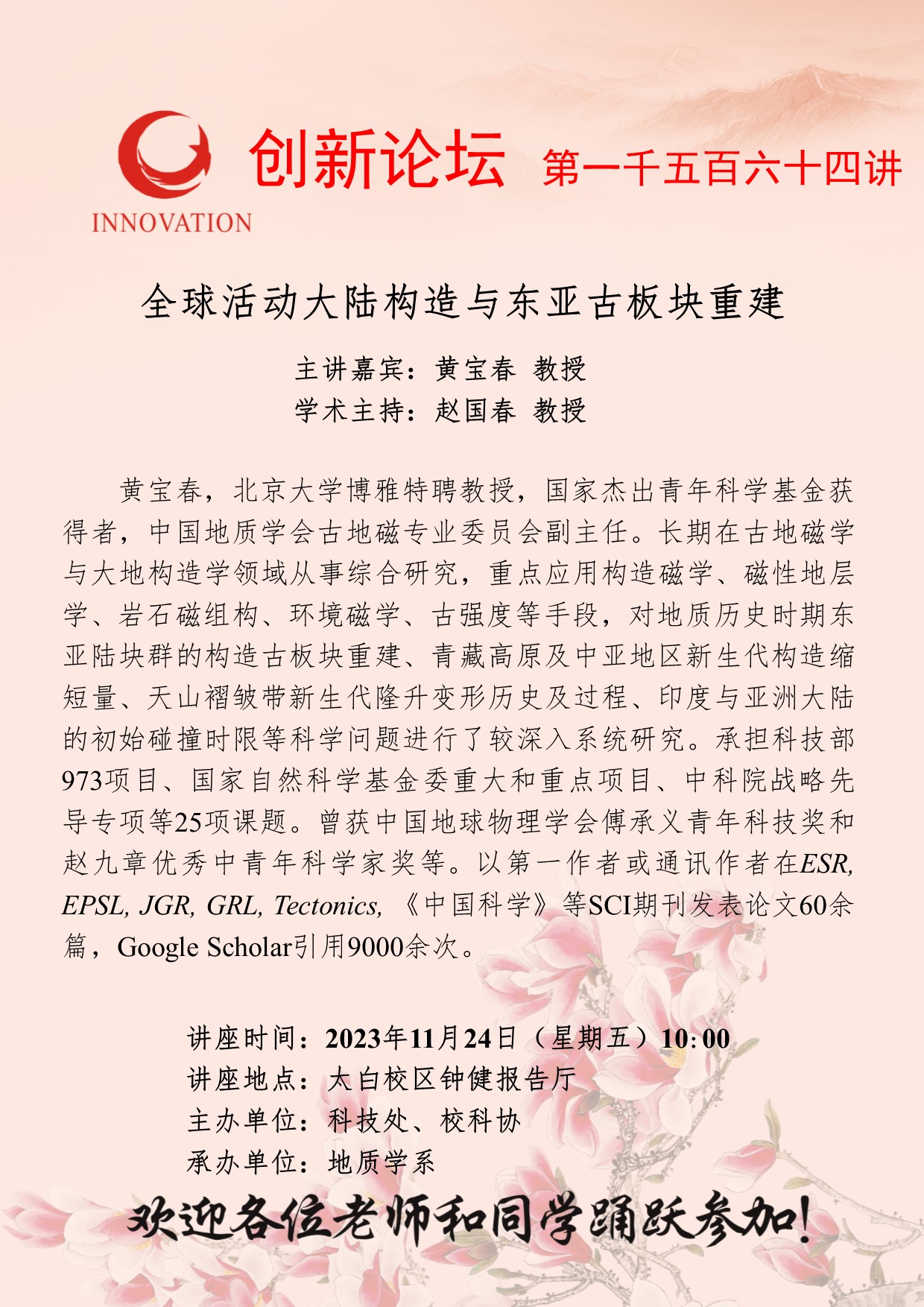 黄宝春 教授 BB平台创新论坛第一千五百六十四讲:全球活动大陆构造与东亚古板块重建 讲座时间 2023年11月24日(星期五)10:00 讲座地点 太白校区钟健报告厅 讲座人介绍 黄宝春 教授 讲座内容
