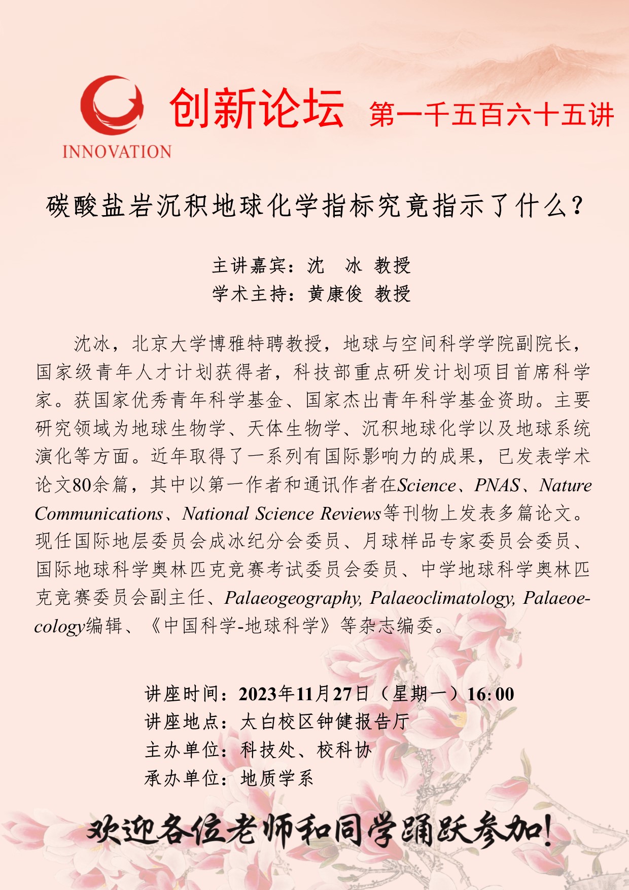 沈冰 教授 BB平台创新论坛第一千五百六十五讲:碳酸盐岩沉积地球化学指标究竟指示了什么? 讲座时间 2023年11月27日(星期一)16:00 讲座地点 太白校区钟健报告厅 讲座人介绍 沈冰 教授 讲座内容