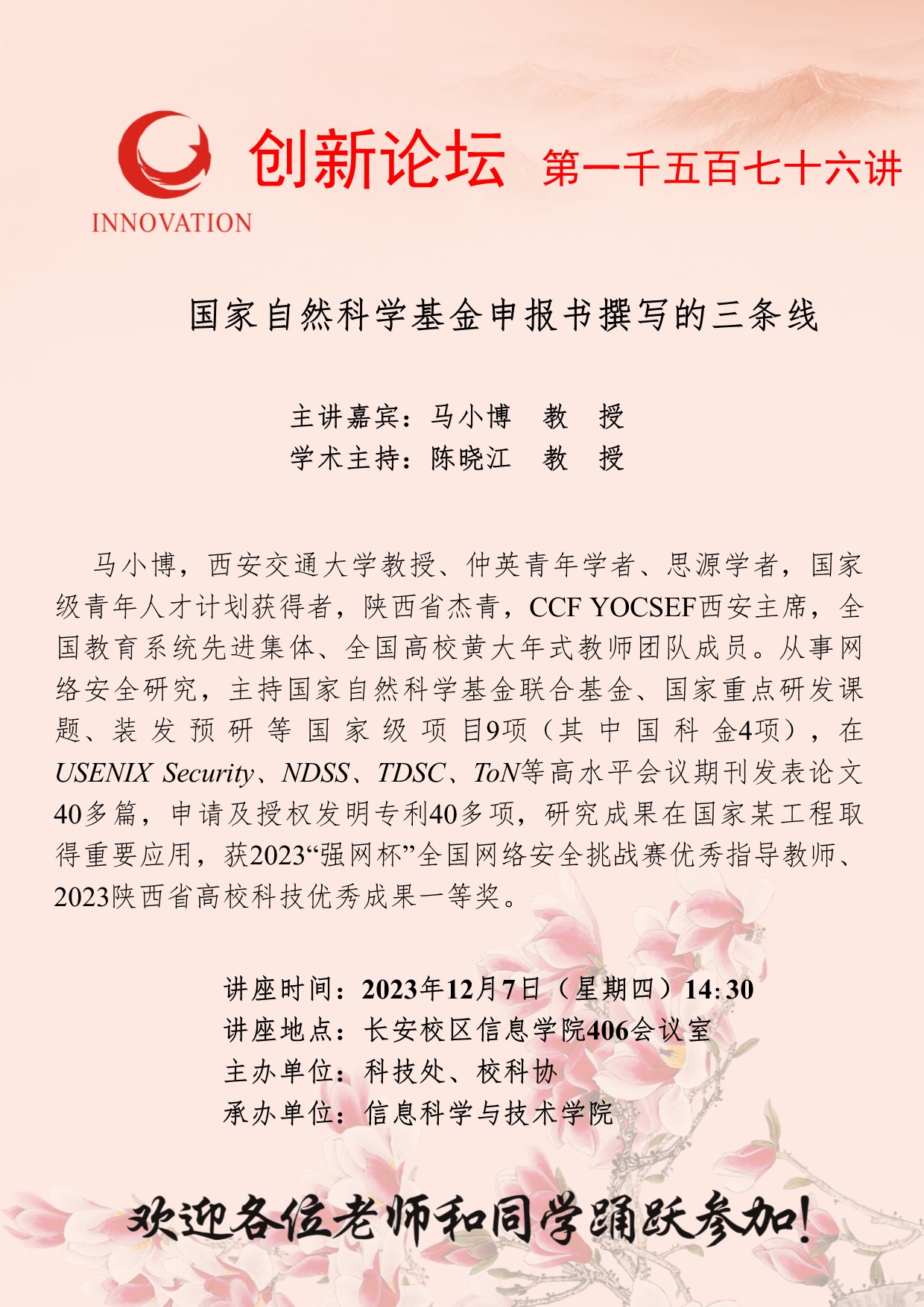 马小博 教授 BB平台创新论坛第一千五百七十六讲:国家自然科学基金申报书撰写的三条线 讲座时间 2023年12月7日(星期四)14:30 讲座地点 长安校区信息学院406会议室 讲座人介绍 马小博 教授 讲座内容