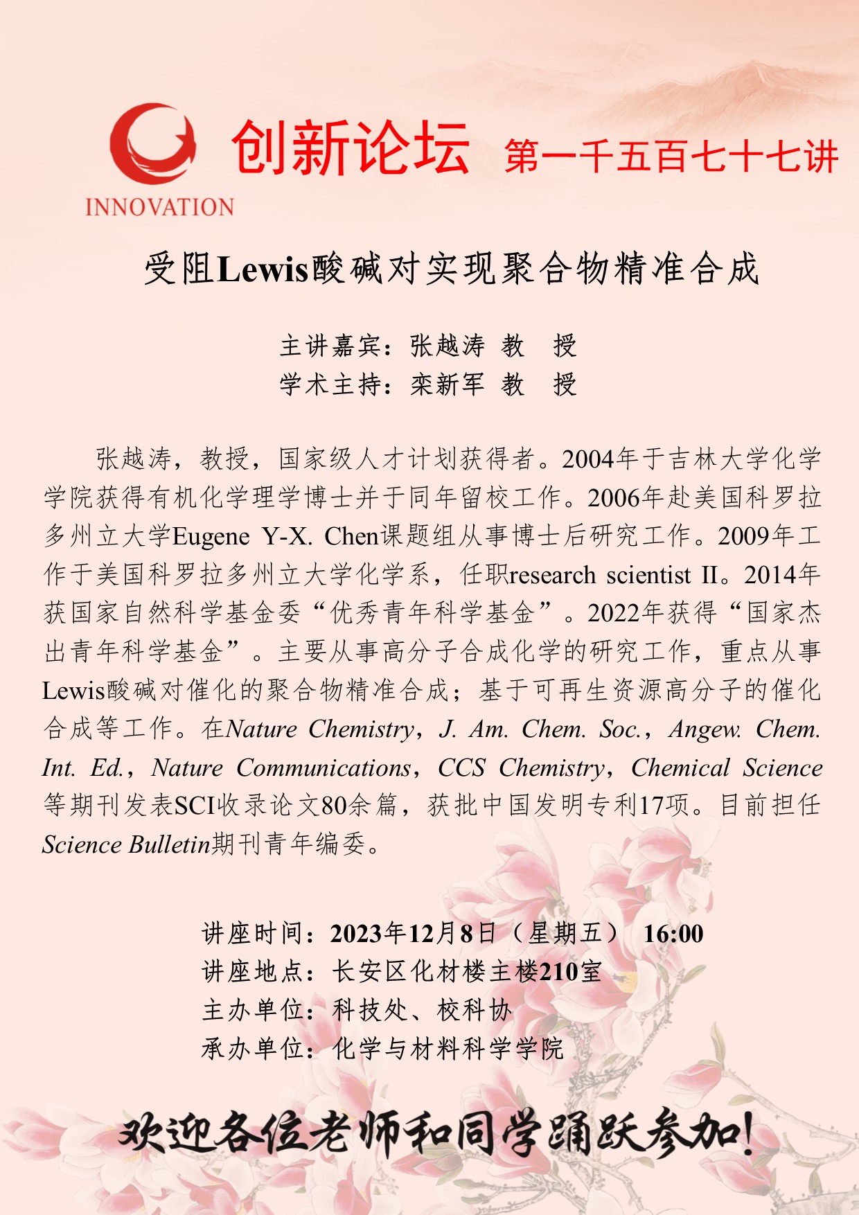 张越涛 教授 BB平台创新论坛第一千五百七十七讲:受阻Lewis酸碱对实现聚合物精准合成 讲座时间 2023年12月8日(星期五) 16:00 讲座地点 长安区化材楼主楼210室 讲座人介绍 张越涛 教授 讲座内容