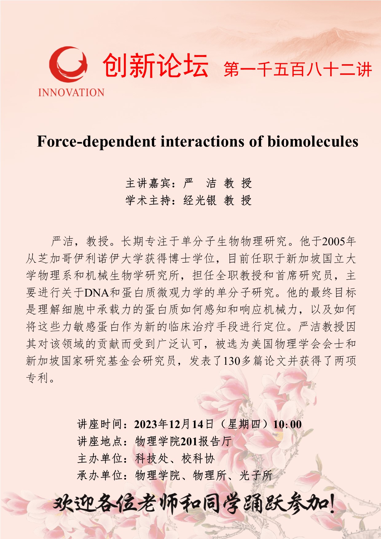 严洁 教授 BB平台创新论坛第一千五百八十二讲:Force-dependent interactions of biomolecules 讲座时间 2023年12月14日(星期四)10:00 讲座地点 物理学院201报告厅 讲座人介绍 严洁 教授 讲座内容