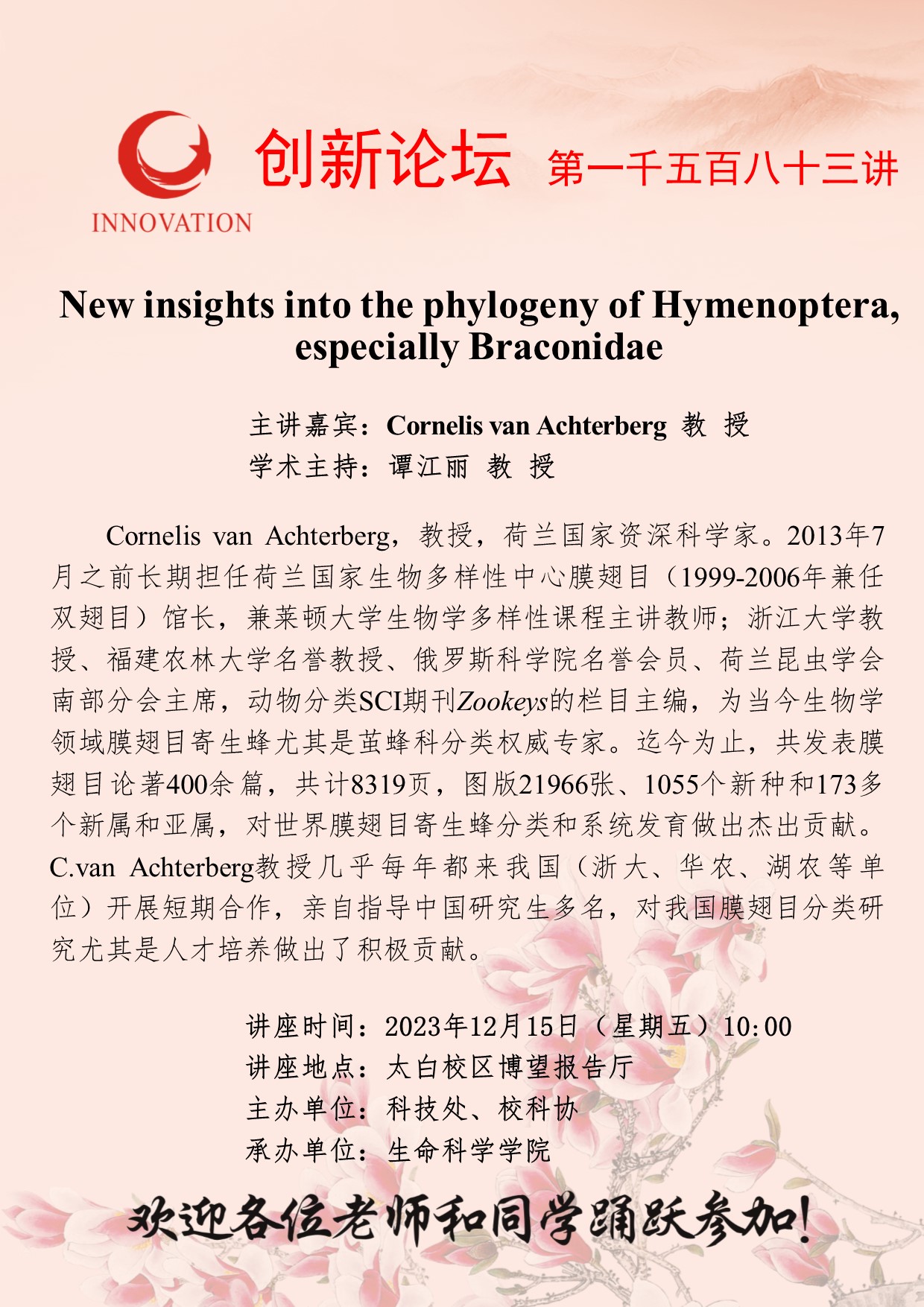 Cornelis van Achterberg 教 授 BB平台创新论坛第一千五百八十三讲:New insights into the phylogeny of Hymenoptera, especially Braconidae 讲座时间 2023年12月15日(星期五)10:00 讲座地点 太白校区博望报告厅 讲座人介绍 Cornelis van Achterberg 教 授 讲座内容