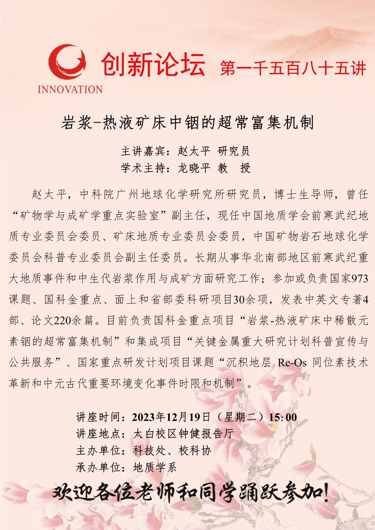 赵太平 研究员 BB平台创新论坛第一千五百八十五讲:岩浆-热液矿床中铟的超常富集机制 讲座时间 2023年12月19日(星期二)15:00 讲座地点 太白校区钟健报告厅 讲座人介绍 赵太平 研究员 讲座内容