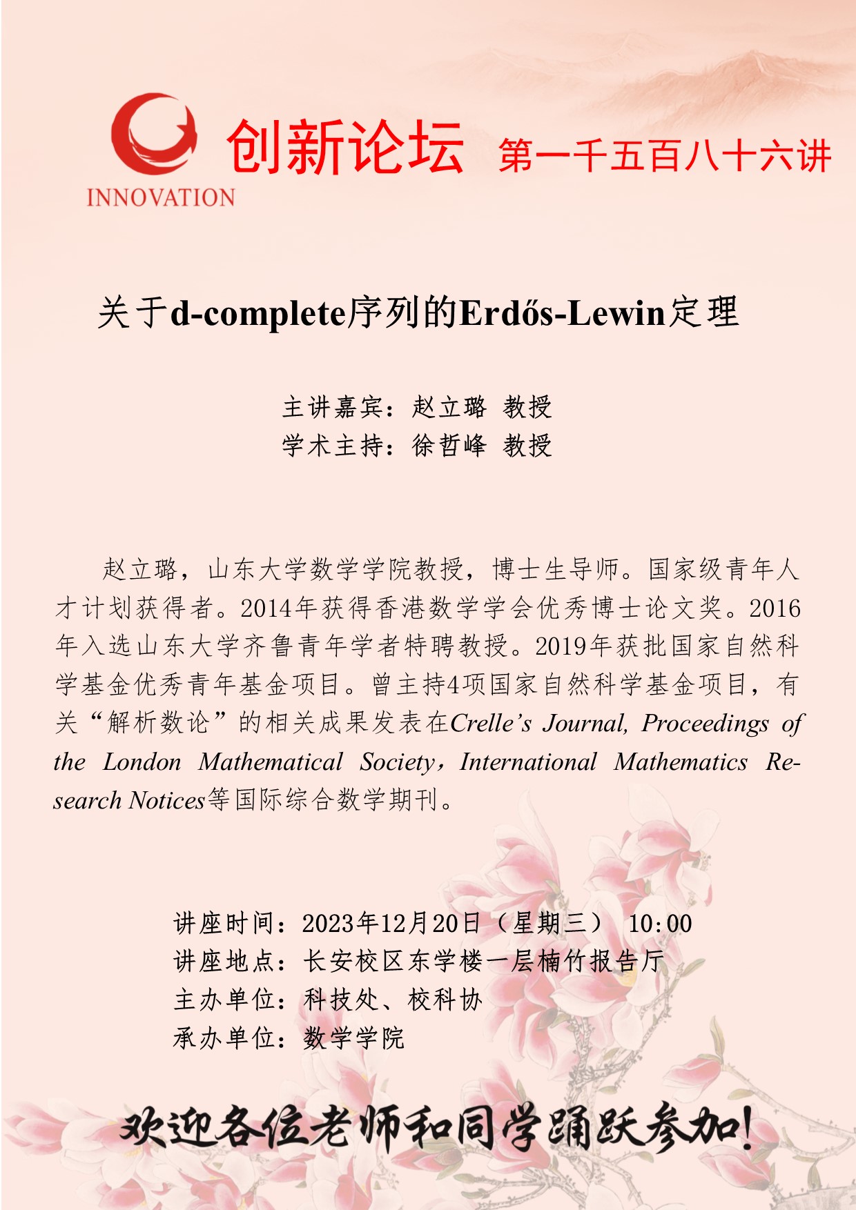 赵立璐 教授 BB平台创新论坛第一千五百八十六讲:关于d-complete序列的Erdős-Lewin定理 讲座时间 2023年12月20日(星期三) 10:00 讲座地点 长安校区东学楼一层楠竹报告厅 讲座人介绍 赵立璐 教授 讲座内容