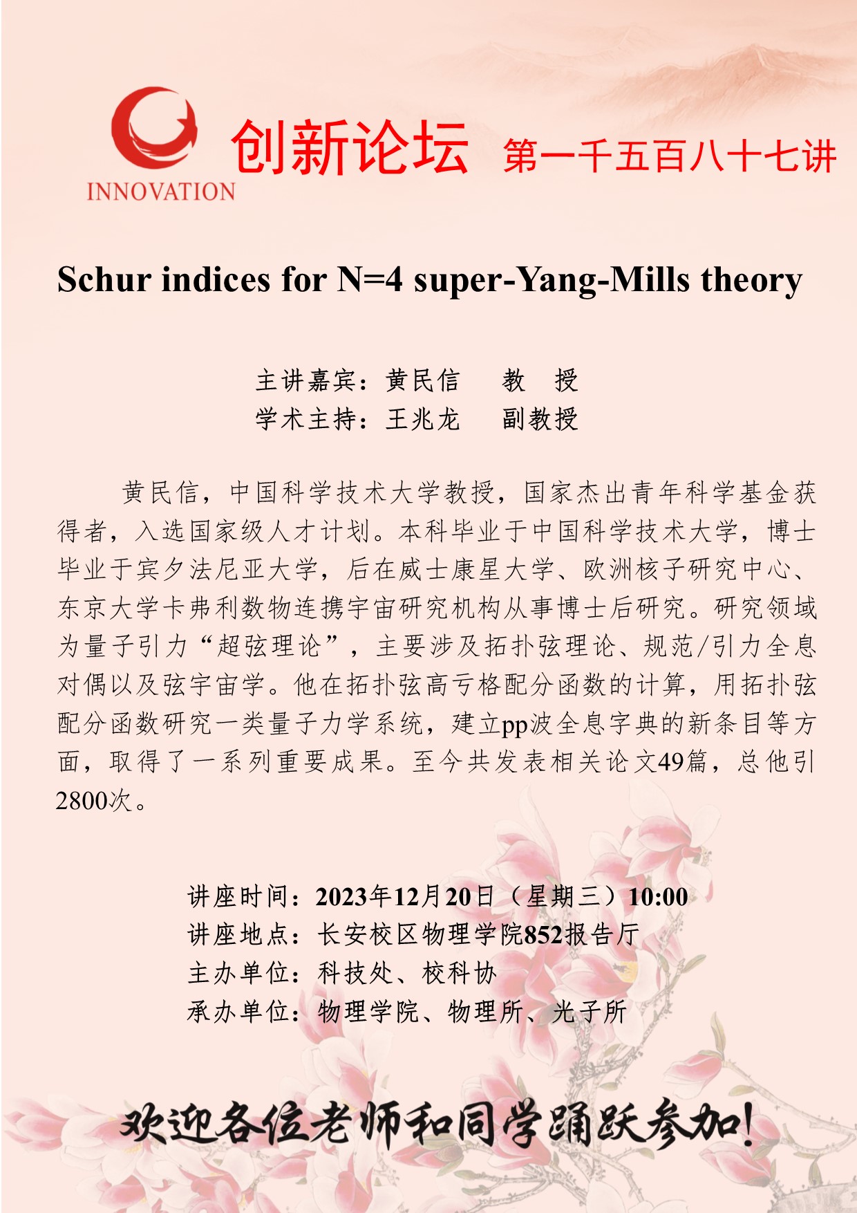 黄民信 教 授 BB平台创新论坛第一千五百八十七讲:Schur indices for N=4 super-Yang-Mills theory 讲座时间 2023年12月20日(星期三)10:00 讲座地点 长安校区物理学院852报告厅 讲座人介绍 黄民信 教 授 讲座内容