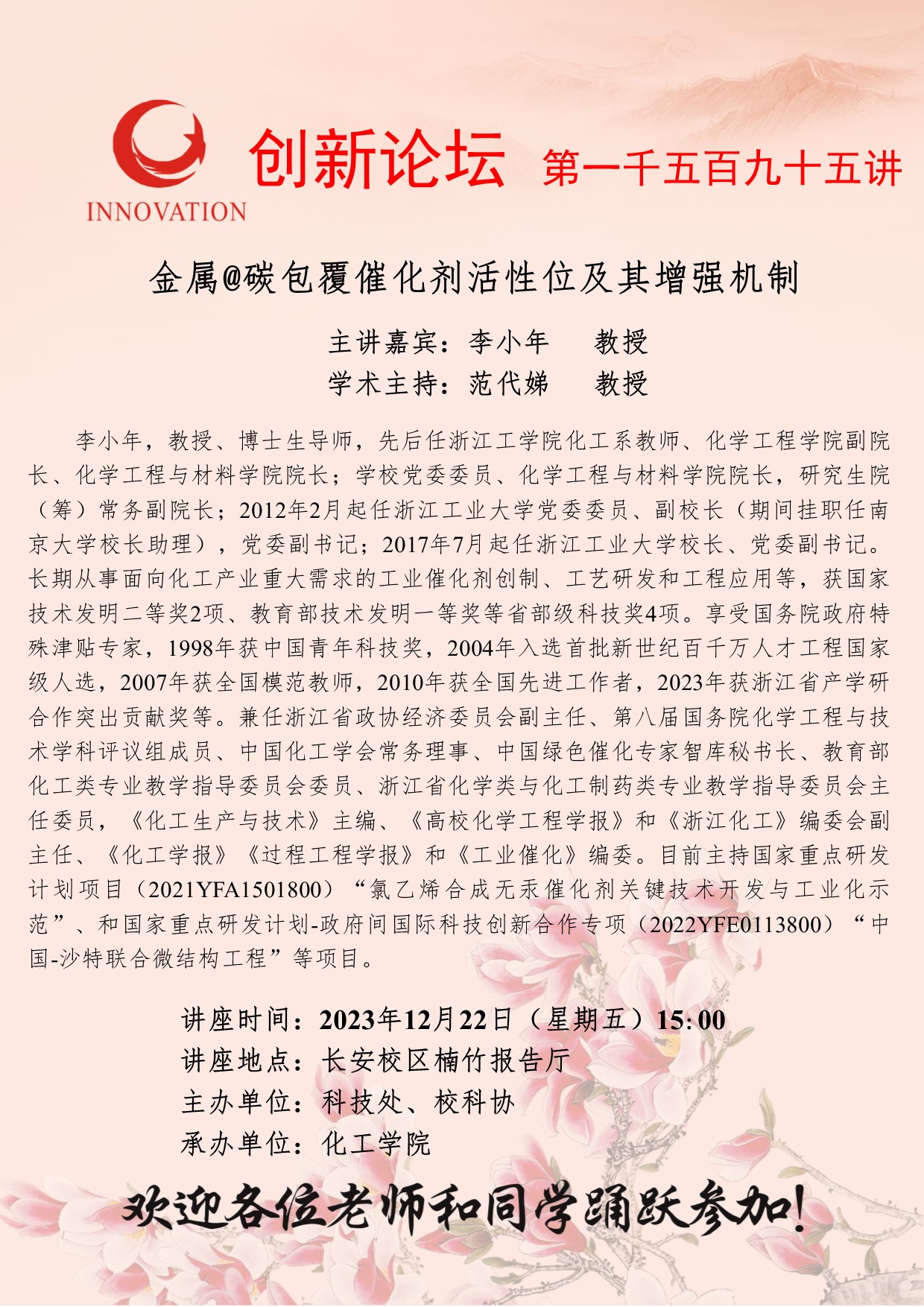 李小年 教授 BB平台创新论坛第一千五百九十五讲:金属@碳包覆催化剂活性位及其增强机制 讲座时间 2023年12月22日(星期五)15:00 讲座地点 长安校区楠竹报告厅 讲座人介绍 李小年 教授 讲座内容