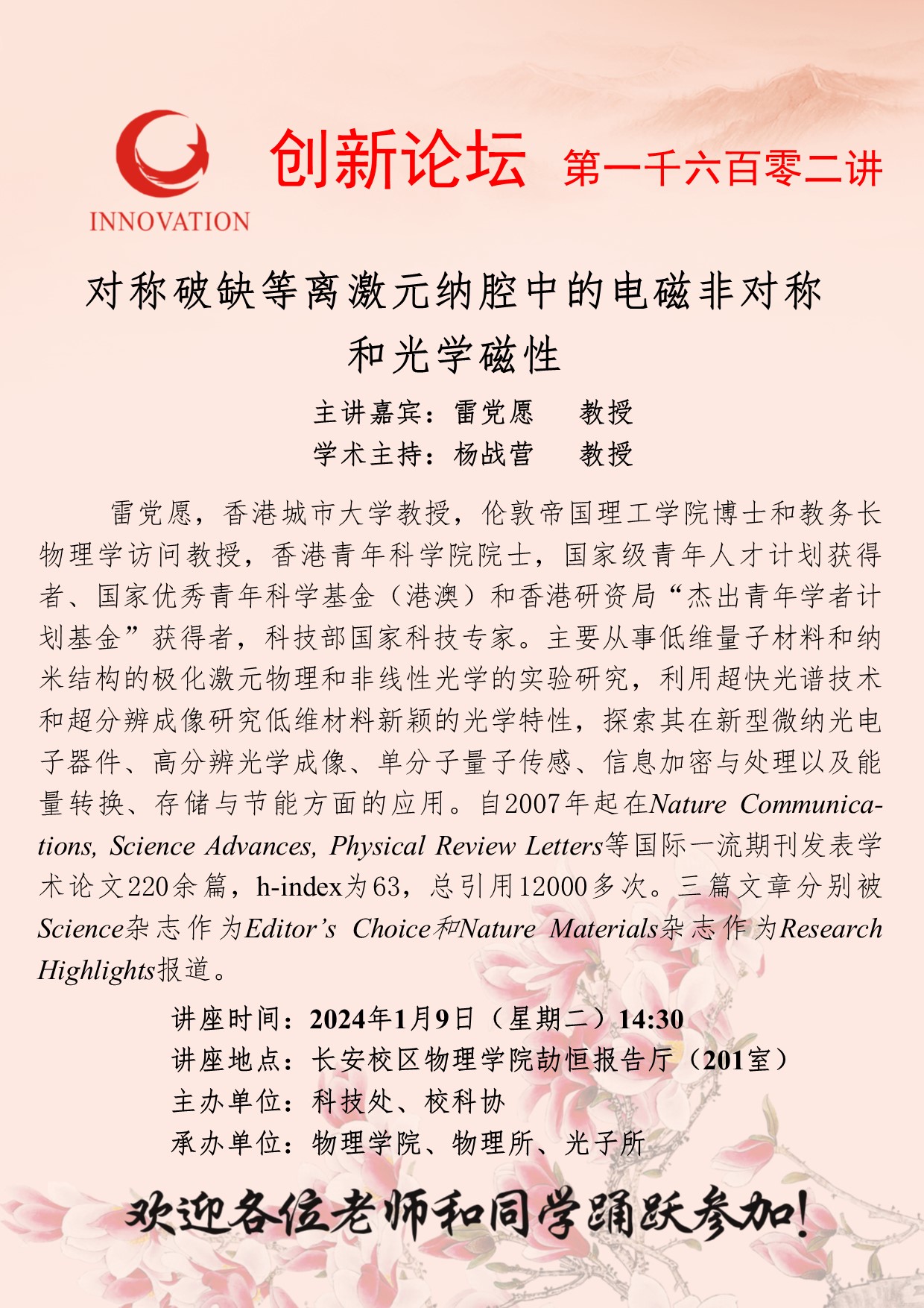 雷党愿 教授 BB平台创新论坛第一千六百零二讲:对称破缺等离激元纳腔中的电磁非对称和光学磁性 讲座时间 2024年1月9日(星期二)14:30 讲座地点 长安校区物理学院劼恒报告厅(201室 讲座人介绍 雷党愿 教授 讲座内容