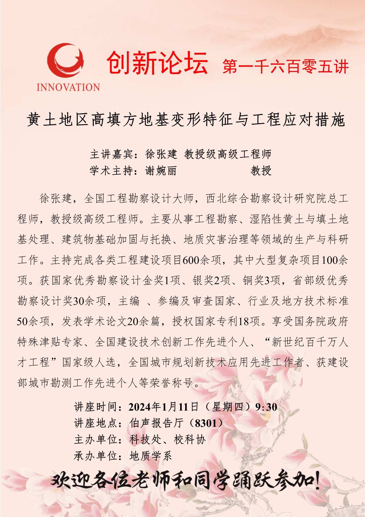 徐张建 教授级高级工程师 BB平台创新论坛第一千六百零五讲:黄土地区高填方地基变形特征与工程应对措施 讲座时间 2024年1月11日(星期四)9:30 讲座地点 伯声报告厅(8301) 讲座人介绍 徐张建 教授级高级工程师 讲座内容