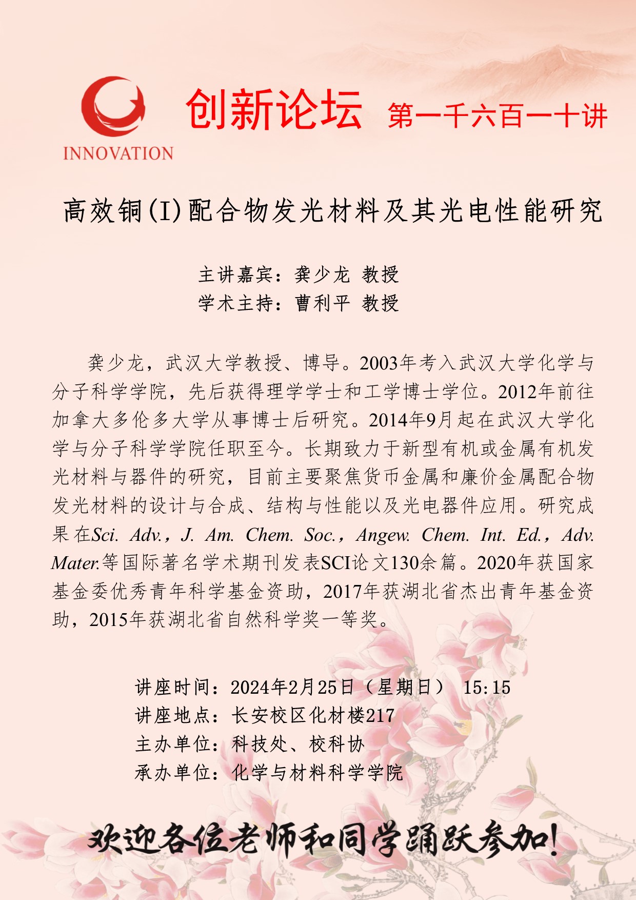 龚少龙 教授 BB平台创新论坛第一千六百一十讲:高效铜(I)配合物发光材料及其光电性能研究 讲座时间 2024年2月25日(星期日) 15:15 讲座地点 长安校区化材楼217 讲座人介绍 龚少龙 教授 讲座内容
