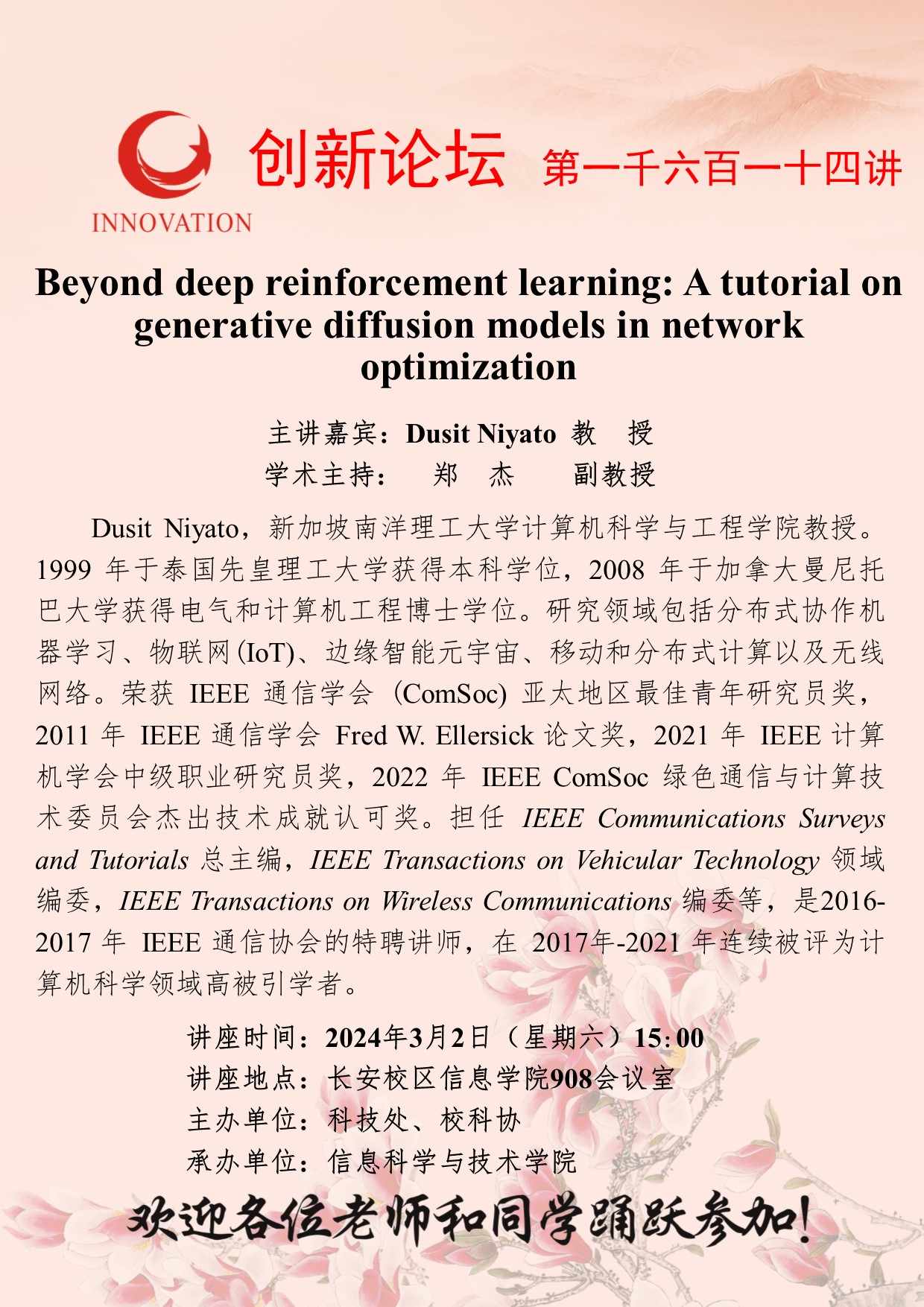 Dusit Niyato 教授 BB平台创新论坛第一千六百一十四讲:Beyond deep reinforcement learning: A tutorial on generative diffusion models in network optimization 讲座时间 2024年3月2日(星期六)15:00 讲座地点 长安校区信息学院908会议室 讲座人介绍 Dusit Niyato 教授 讲座内容