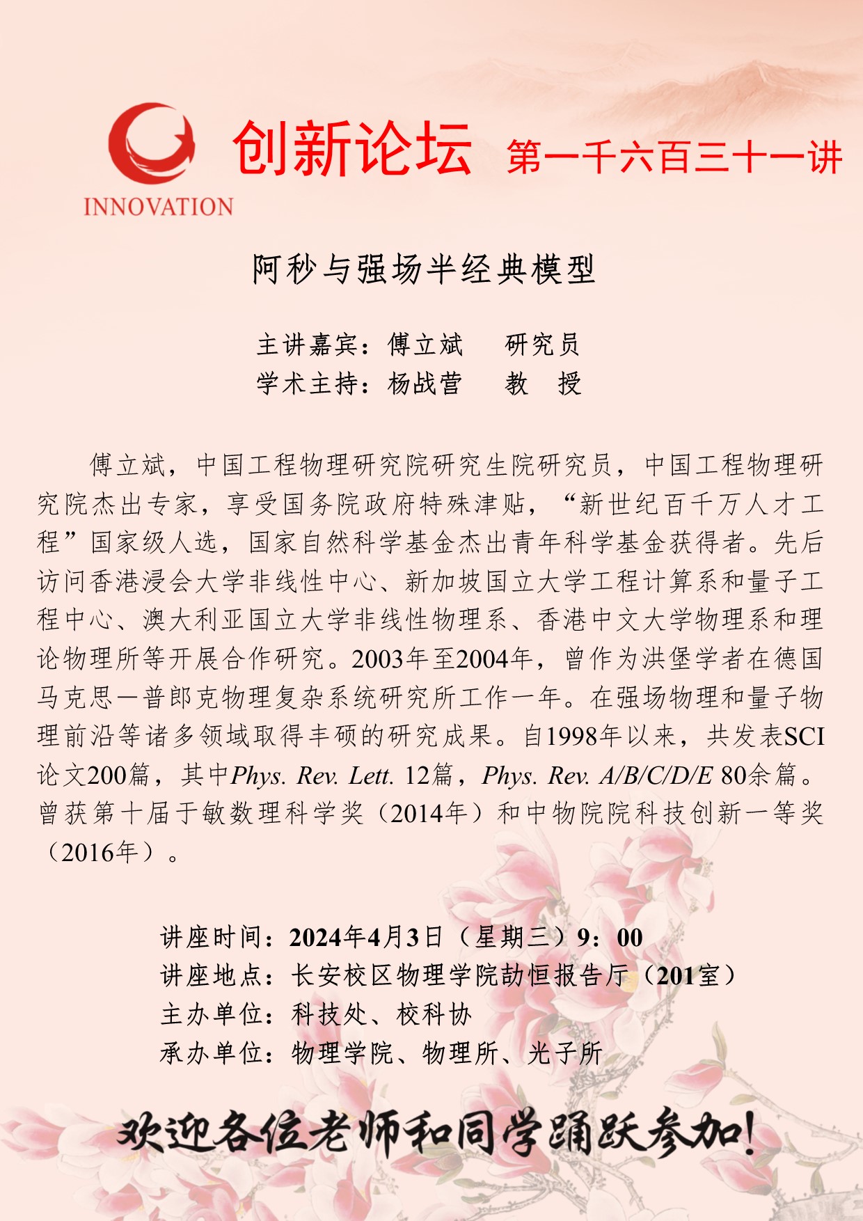 傅立斌 研究员 BB平台创新论坛第一千六百三十一讲:阿秒与强场半经典模型 讲座时间 2024年4月3日(星期三)9:00 讲座地点 长安校区物理学院劼恒报告厅(201室) 讲座人介绍 傅立斌 研究员 讲座内容