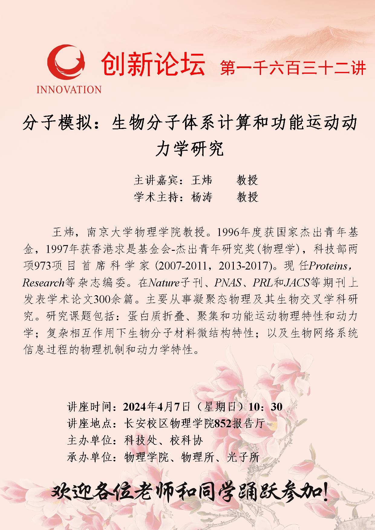 王炜 教授 BB平台创新论坛第一千六百三十二讲:分子模拟:生物分子体系计算和功能运动动力学研究 讲座时间 2024年4月7日(星期日)10:30 讲座地点 长安校区物理学院852报告厅 讲座人介绍 王炜 教授 讲座内容