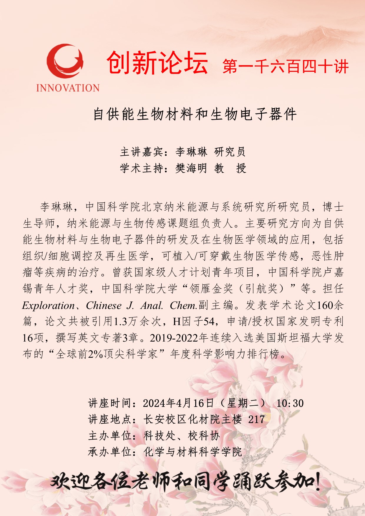 李琳琳 研究员 BB平台创新论坛第一千六百四十讲:自供能生物材料和生物电子器件 讲座时间 2024年4月16日(星期二) 10:30 讲座地点 长安校区化材院主楼 217 讲座人介绍 李琳琳 研究员 讲座内容