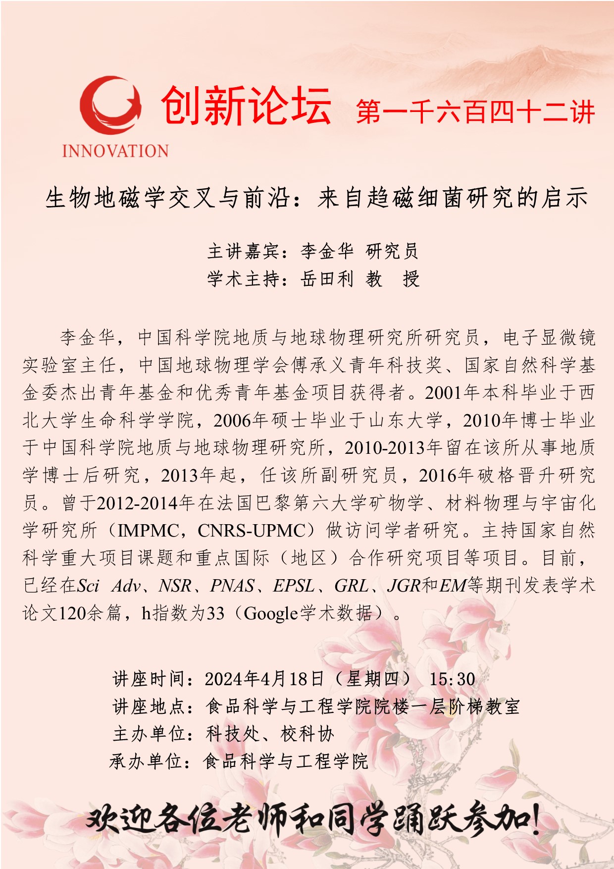 李金华 研究员 BB平台创新论坛第一千六百四十二讲:生物地磁学交叉与前沿:来自趋磁细菌研究的启示 讲座时间 2024年4月18日(星期四) 15:30 讲座地点 食品科学与工程学院院楼一层阶梯教室 讲座人介绍 李金华 研究员 讲座内容