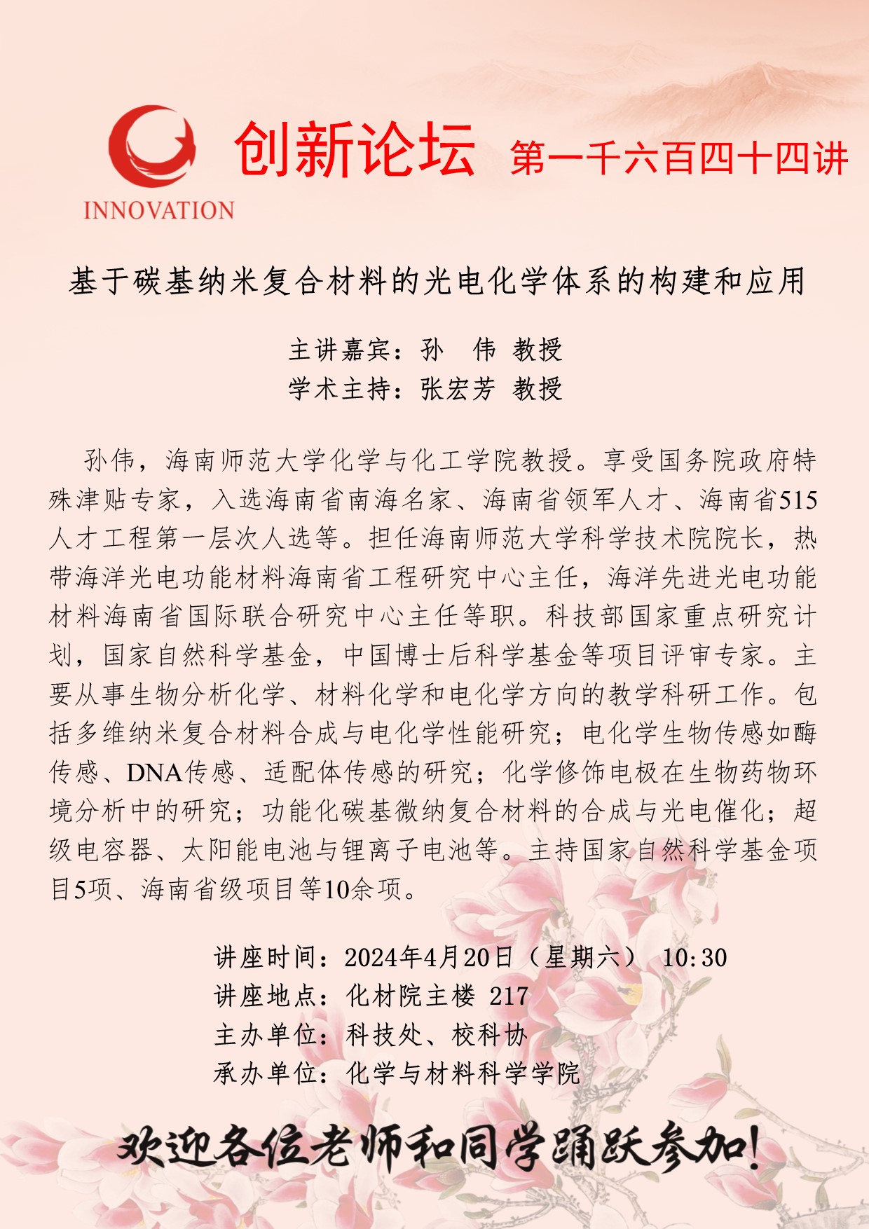 孙伟 教授 BB平台创新论坛第一千六百四十四讲:基于碳基纳米复合材料的光电化学体系的构建和应用 讲座时间 2024年4月20日(星期六) 10:30 讲座地点 化材院主楼 217 讲座人介绍 孙伟 教授 讲座内容