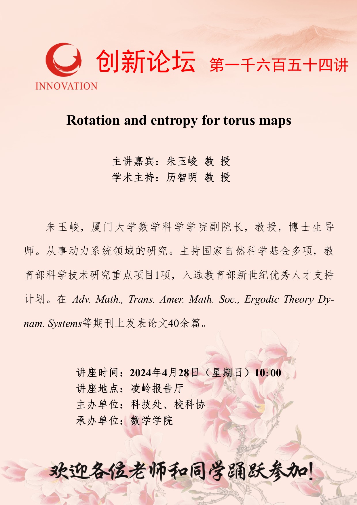 朱玉峻 教授 BB平台创新论坛第一千六百五十四讲:Rotation and entropy for torus maps 讲座时间 2024年4月28日(星期日)10:00 讲座地点 凌岭报告厅 讲座人介绍 朱玉峻 教授 讲座内容