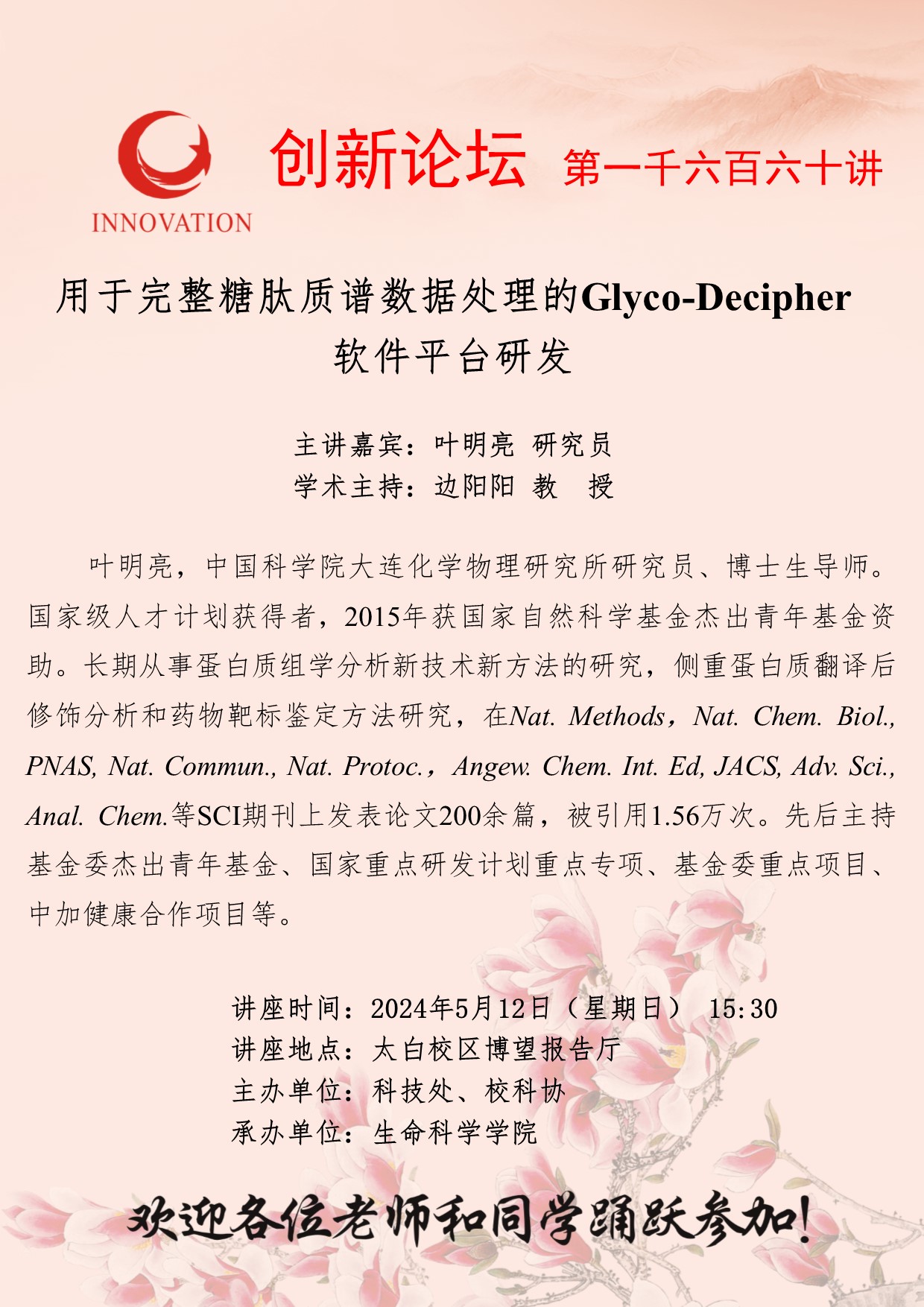 叶明亮 研究员 BB平台创新论坛第一千六百六十讲:用于完整糖肽质谱数据处理的Glyco-Decipher软件平台研发 讲座时间 2024年5月12日(星期日) 15:30 讲座地点 太白校区博望报告厅 讲座人介绍 叶明亮 研究员 讲座内容