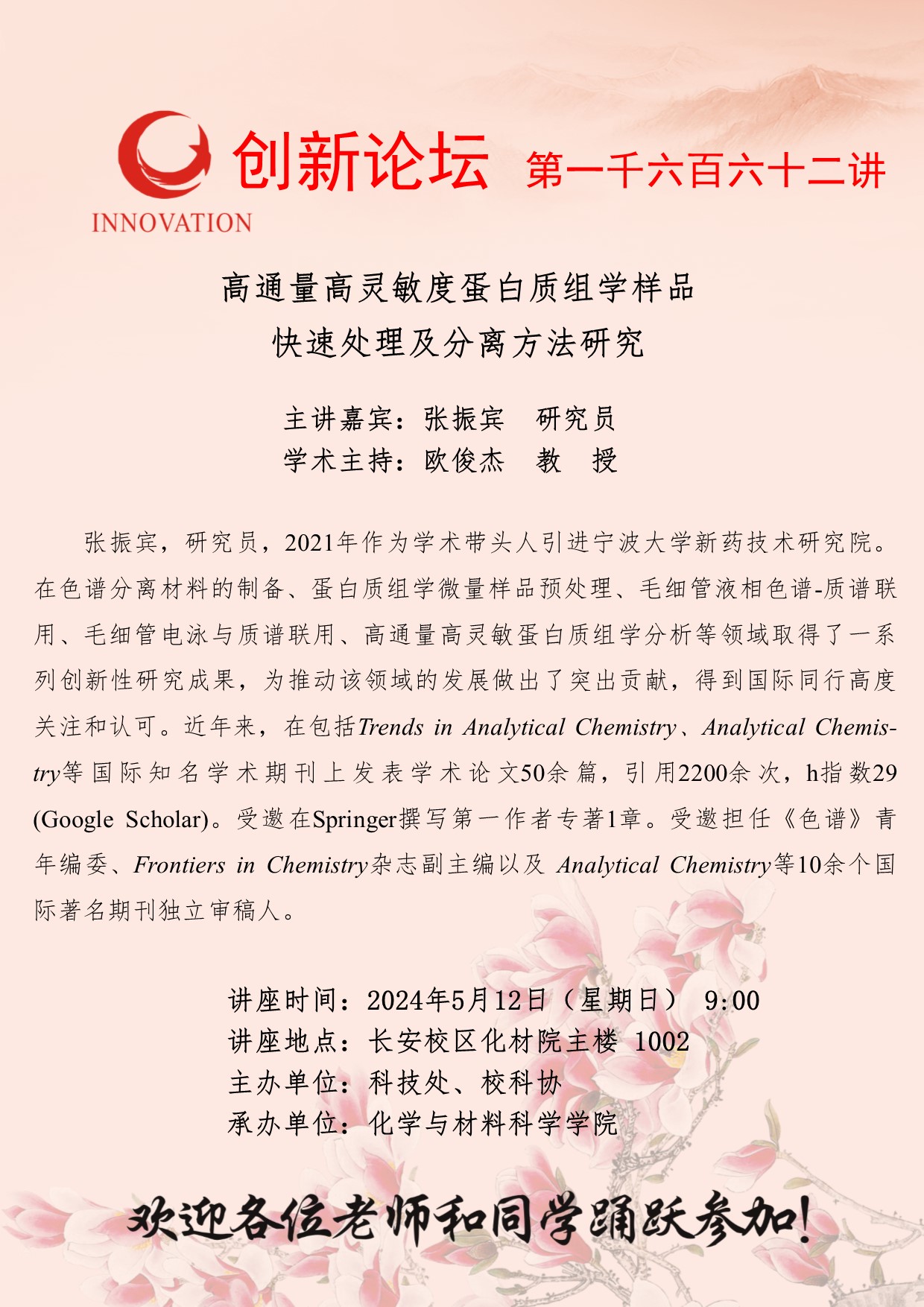 张振宾 研究员 BB平台创新论坛第一千六百六十二讲:高通量高灵敏度蛋白质组学样品快速处理及分离方法研究 讲座时间 2024年5月12日(星期日) 9:00 讲座地点 长安校区化材院主楼 讲座人介绍 张振宾 研究员 讲座内容