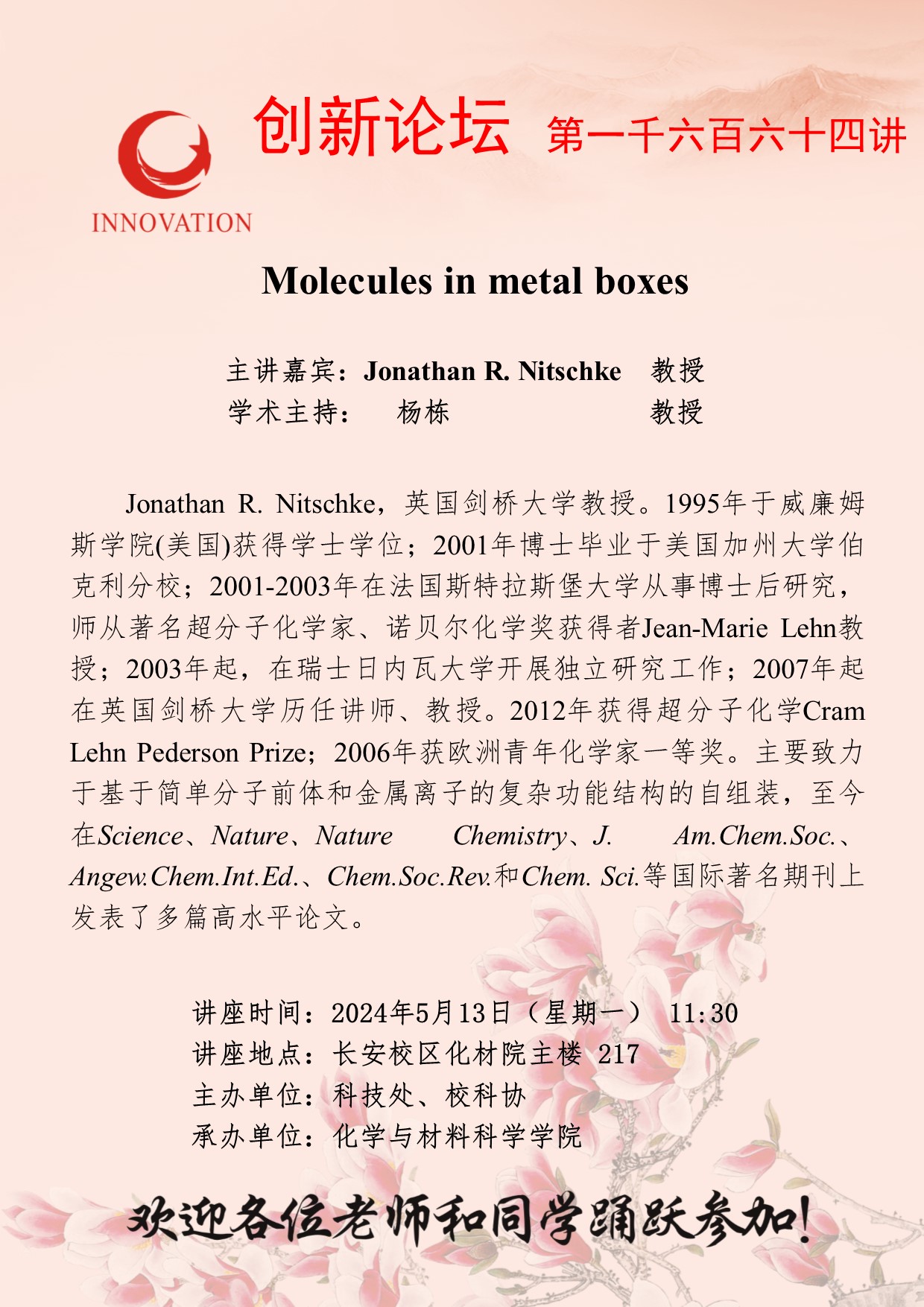 Jonathan R. Nitschke 教授 BB平台创新论坛第一千六百六十四讲:Molecules in metal boxes 讲座时间 2024年5月13日(星期一) 11:30 讲座地点 长安校区化材院主楼 217 讲座人介绍 Jonathan R. Nitschke 教授 讲座内容