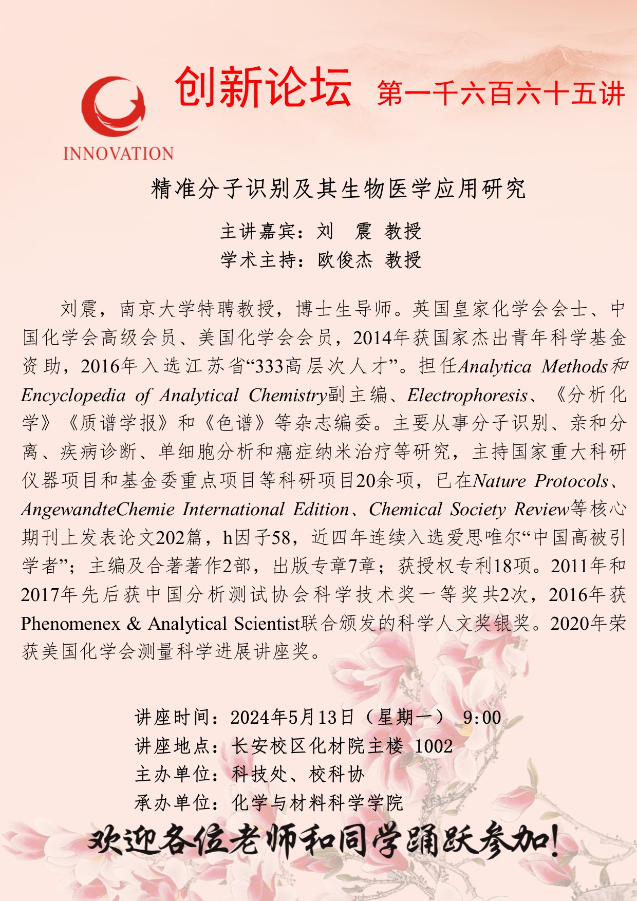 刘 震 教授 BB平台创新论坛第一千六百六十五讲:精准分子识别及其生物医学应用研究 讲座时间 2024年5月13日(星期一) 9:00 讲座地点 长安校区化材院主楼 1002 室 讲座人介绍 刘 震 教授 讲座内容