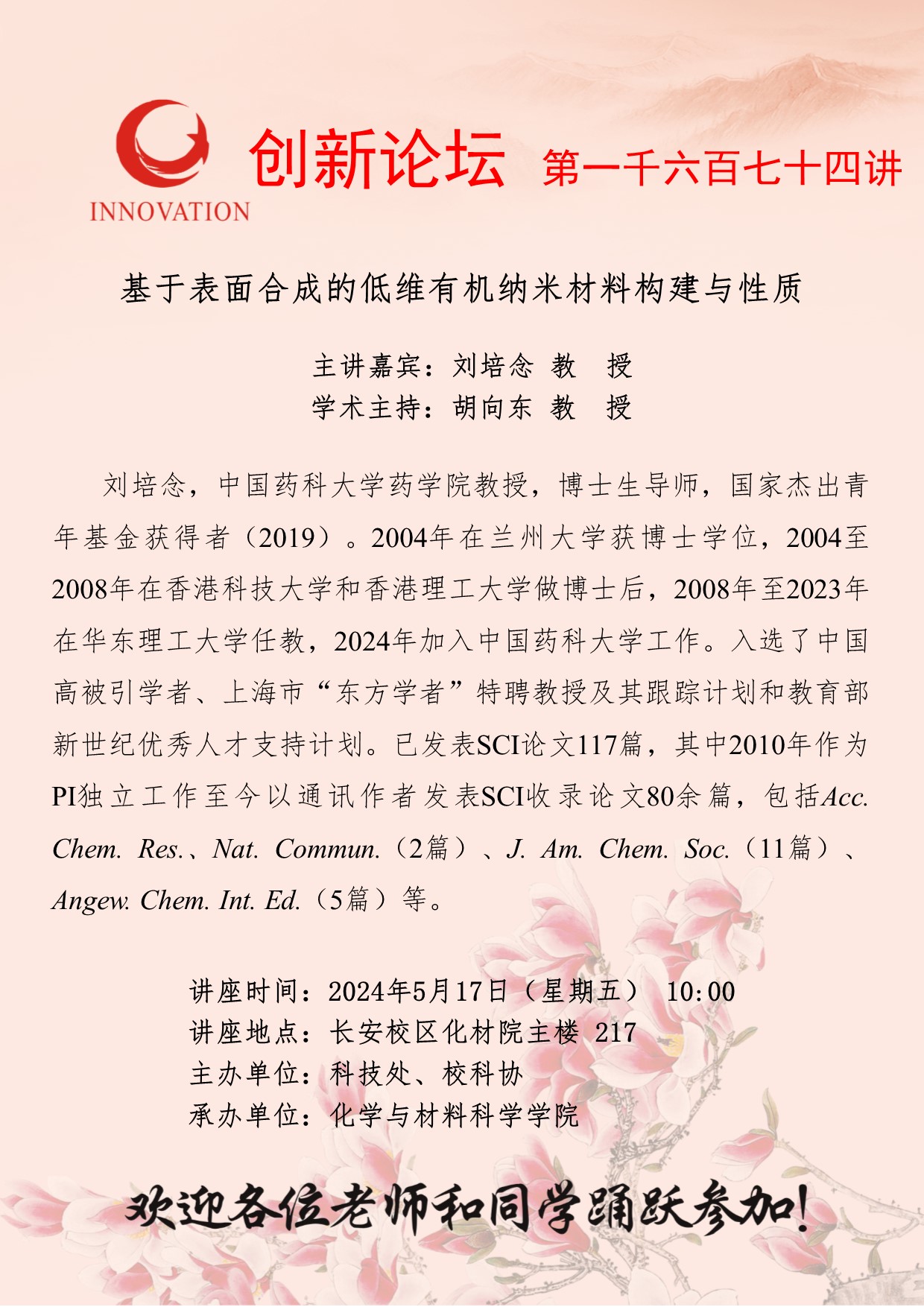 刘培念 教授 BB平台创新论坛第一千六百七十四讲:基于表面合成的低维有机纳米材料构建与性质 讲座时间 2024年5月17日(星期五) 10:00 讲座地点 长安校区化材院主楼 217 讲座人介绍 刘培念 教授 讲座内容