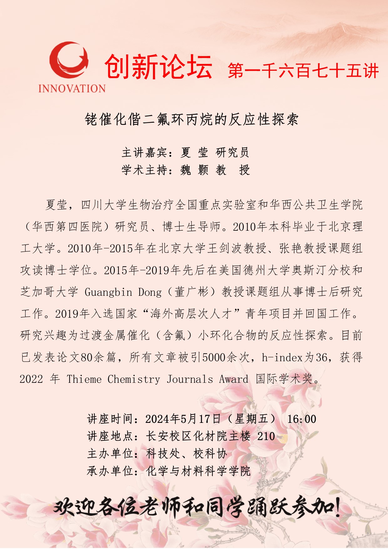 夏莹 研究员 BB平台创新论坛第一千六百七十五讲:铑催化偕二氟环丙烷的反应性探索 讲座时间 2024年5月17日(星期五) 16:00 讲座地点 长安校区化材院主楼 210 讲座人介绍 夏莹 研究员 讲座内容
