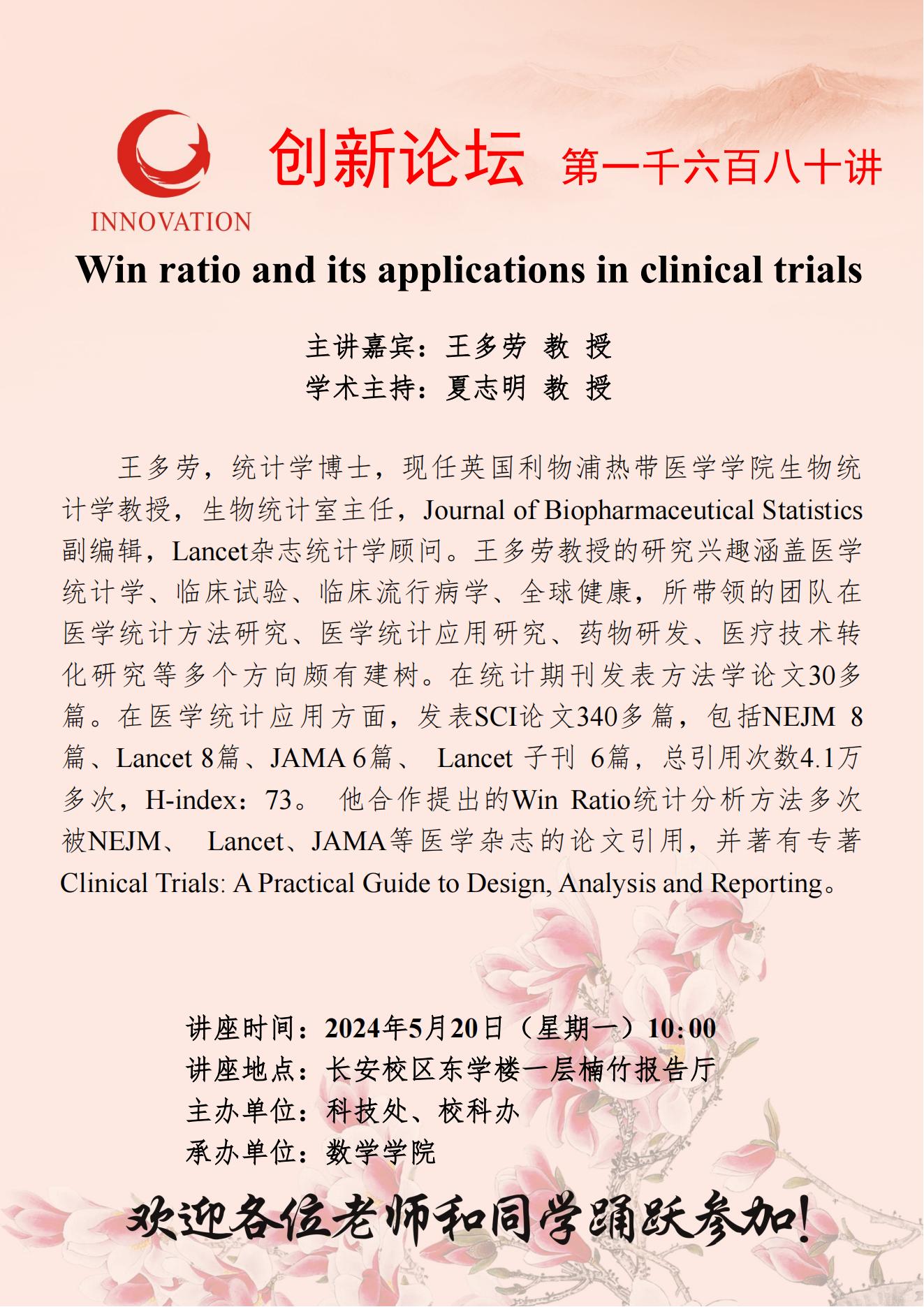 王多劳 教授 BB平台创新论坛第一千六百八十讲:Win ratio and its applications in clinical trials 讲座时间 2024年5月20日(星期一) 10:00 讲座地点 长安校区东学楼一层楠竹报告厅 讲座人介绍 王多劳 教授 讲座内容
