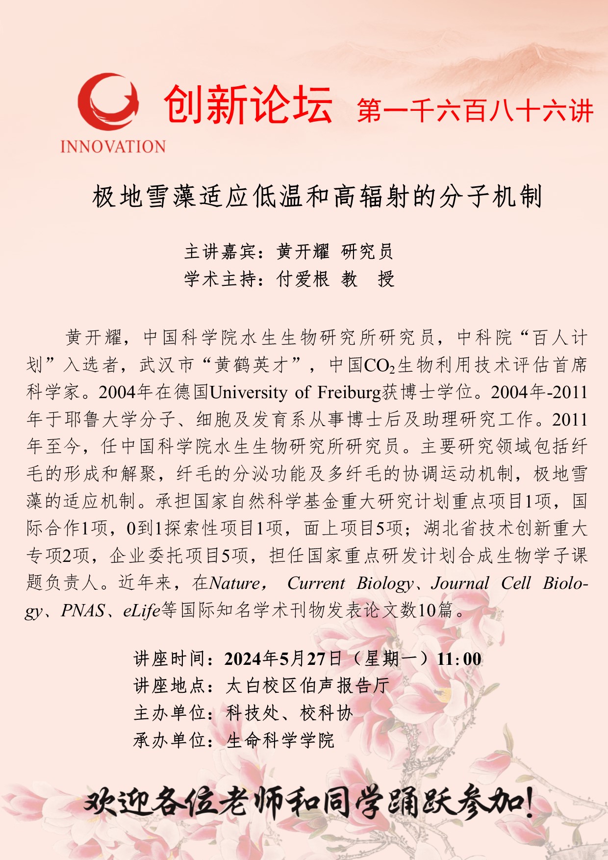 黄开耀 研究员 BB平台创新论坛第一千六百八十六讲:极地雪藻适应低温和高辐射的分子机制 讲座时间 2024年5月27日(星期一)11:00 讲座地点 太白校区伯声报告厅 讲座人介绍 黄开耀 研究员 讲座内容