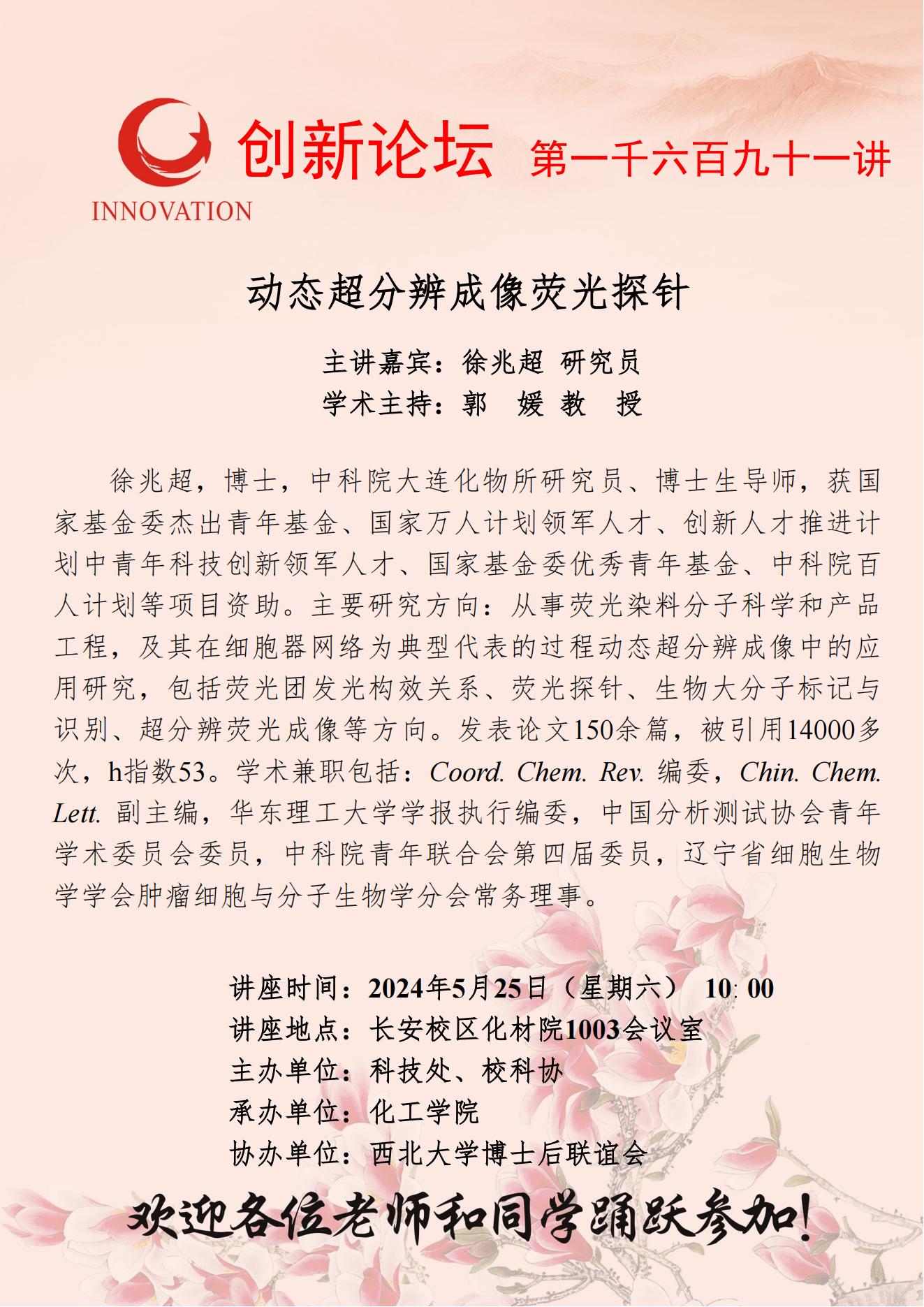 徐兆超 研究员 BB平台创新论坛第一千六百九十一讲:动态超分辨成像荧光探针 讲座时间 2024年5月25日(星期六) 10: 00 讲座地点 长安校区化材院1003会议室 讲座人介绍 徐兆超 研究员 讲座内容
