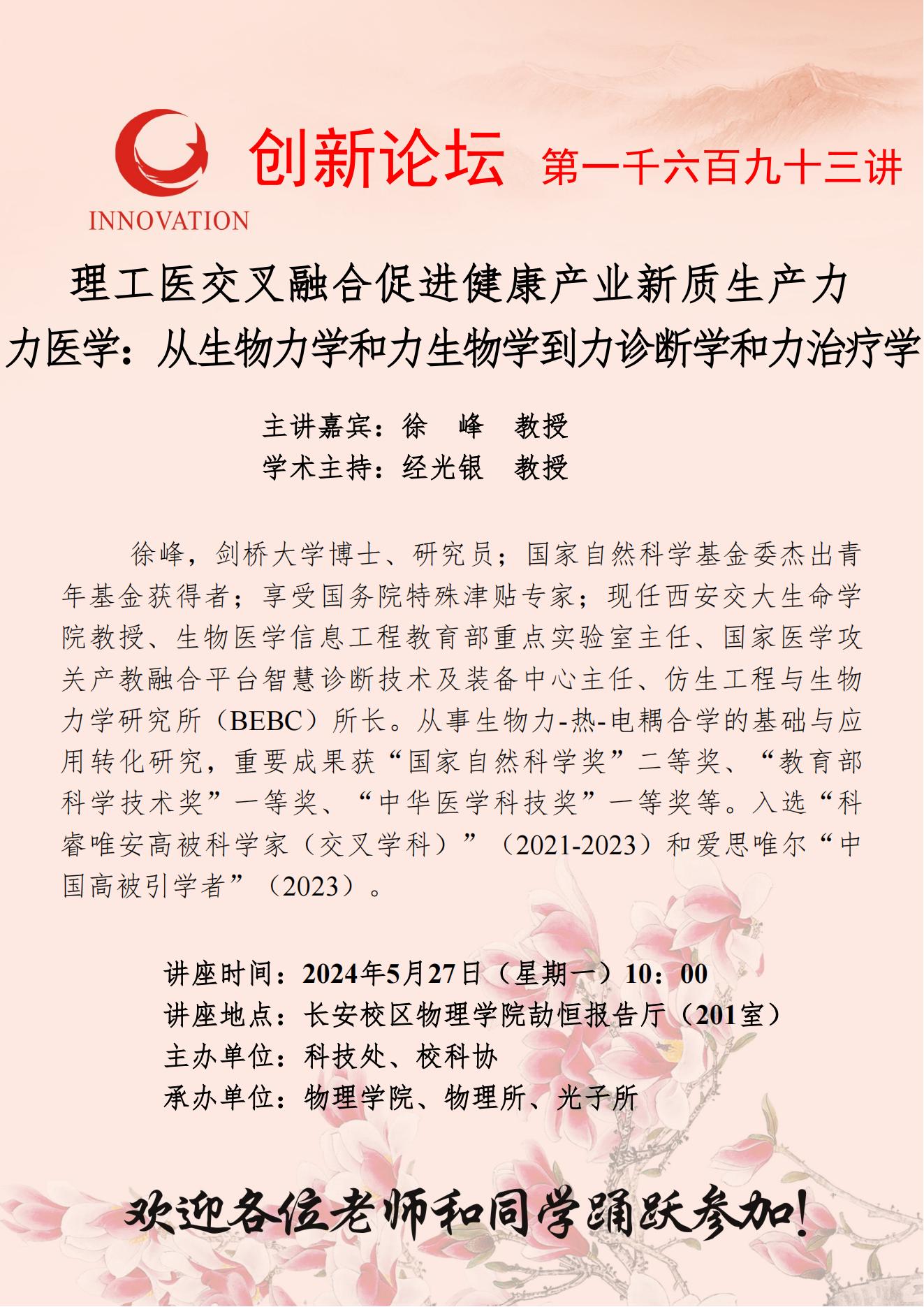 徐峰 教授 BB平台创新论坛第一千六百九十三讲:理工医交叉融合促进健康产业新质生产力——力医学:从生物力学和力生物学到力诊断学和力治疗学 讲座时间 2024年5月27日(星期一)10:00 讲座地点 长安校区物理学院劼恒报告厅(201室) 讲座人介绍 徐峰 教授 讲座内容