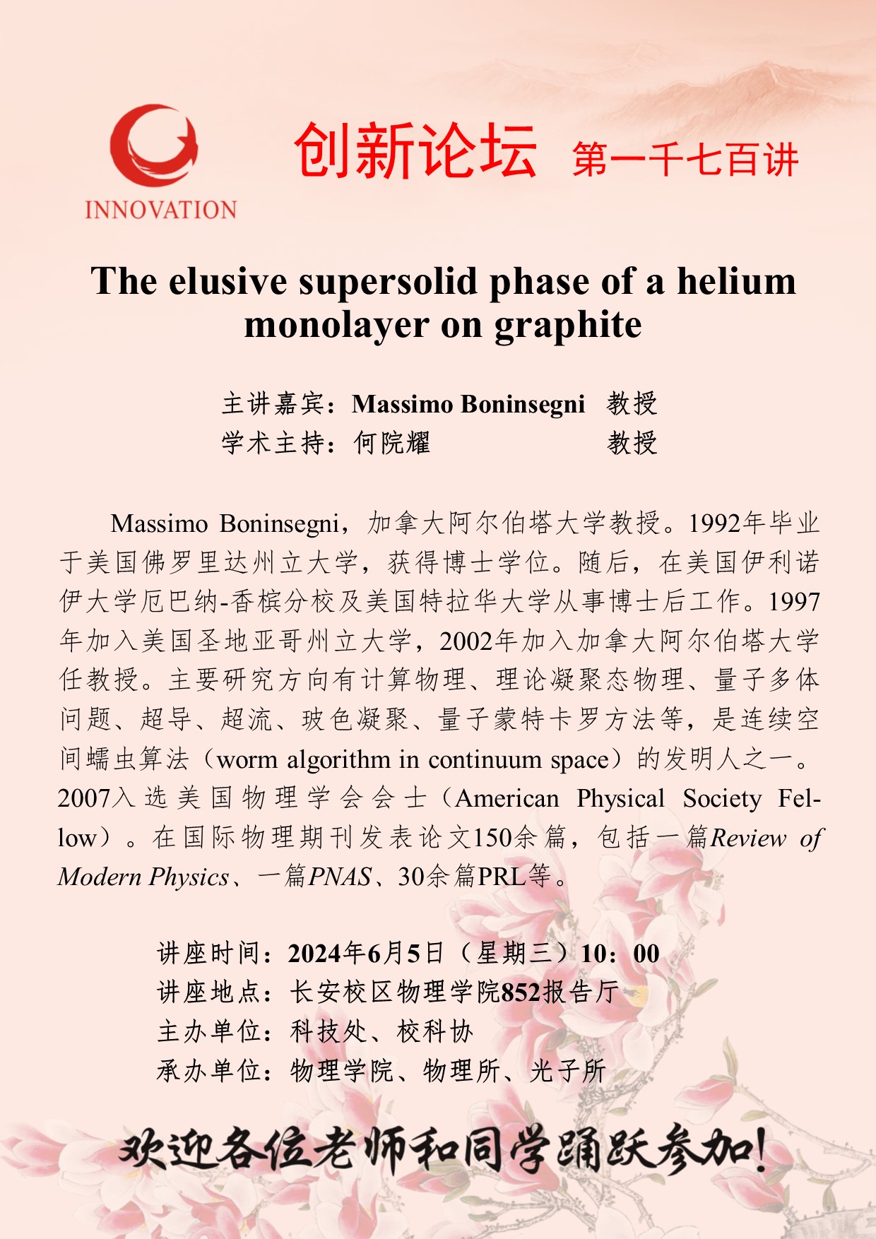 Massimo Boninsegni 教授 BB平台创新论坛第一千七百讲:The elusive supersolid phase of a helium monolayer on graphite 讲座时间 2024年6月5日(星期三)10:00 讲座地点 长安校区物理学院852报告厅 讲座人介绍 Massimo Boninsegni 教授 讲座内容