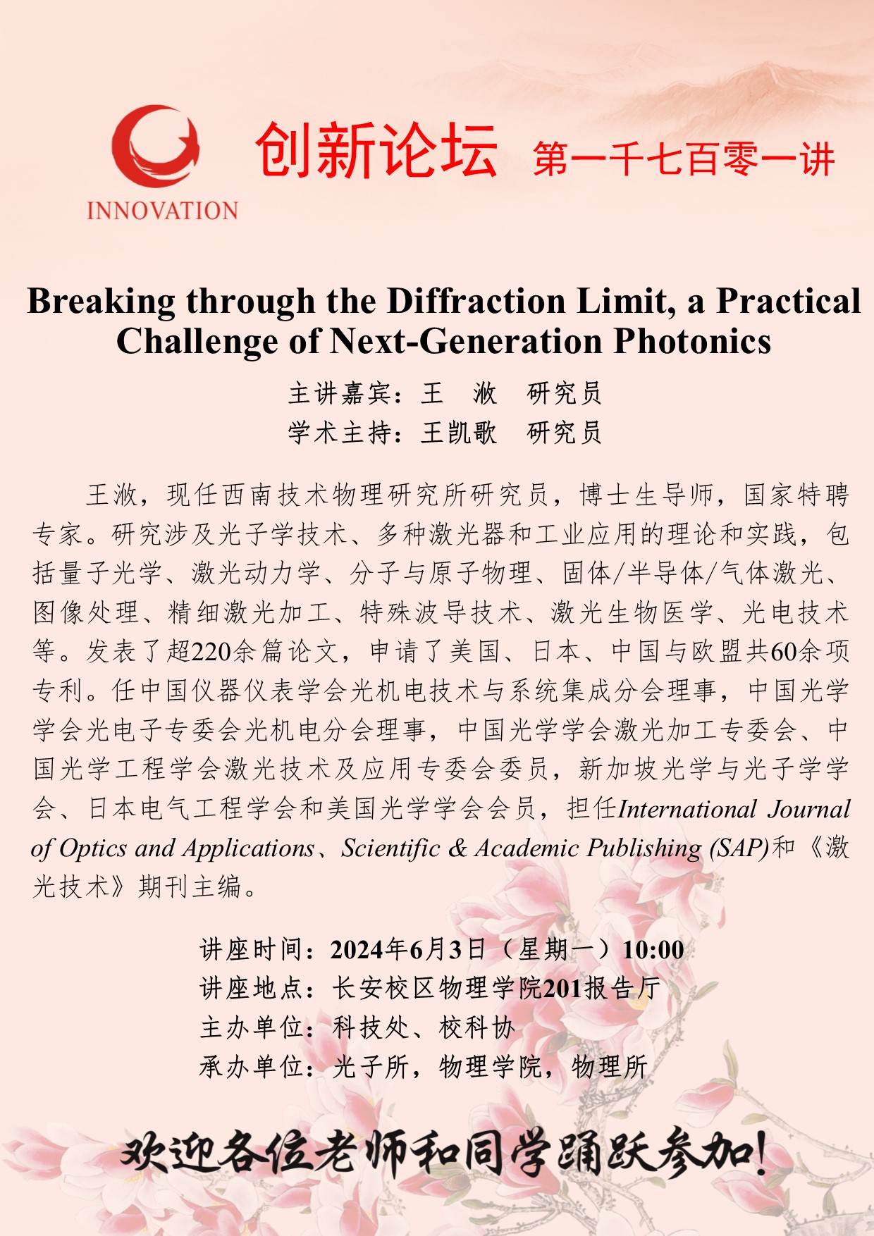 王浟 研究员 BB平台创新论坛第一千七百零一讲:Breaking through the Diffraction Limit, a Practical Challenge of Next-Generation Photonics 讲座时间 2024年6月3日(星期一)10:00 讲座地点 长安校区物理学院201报告厅 讲座人介绍 王浟 研究员 讲座内容