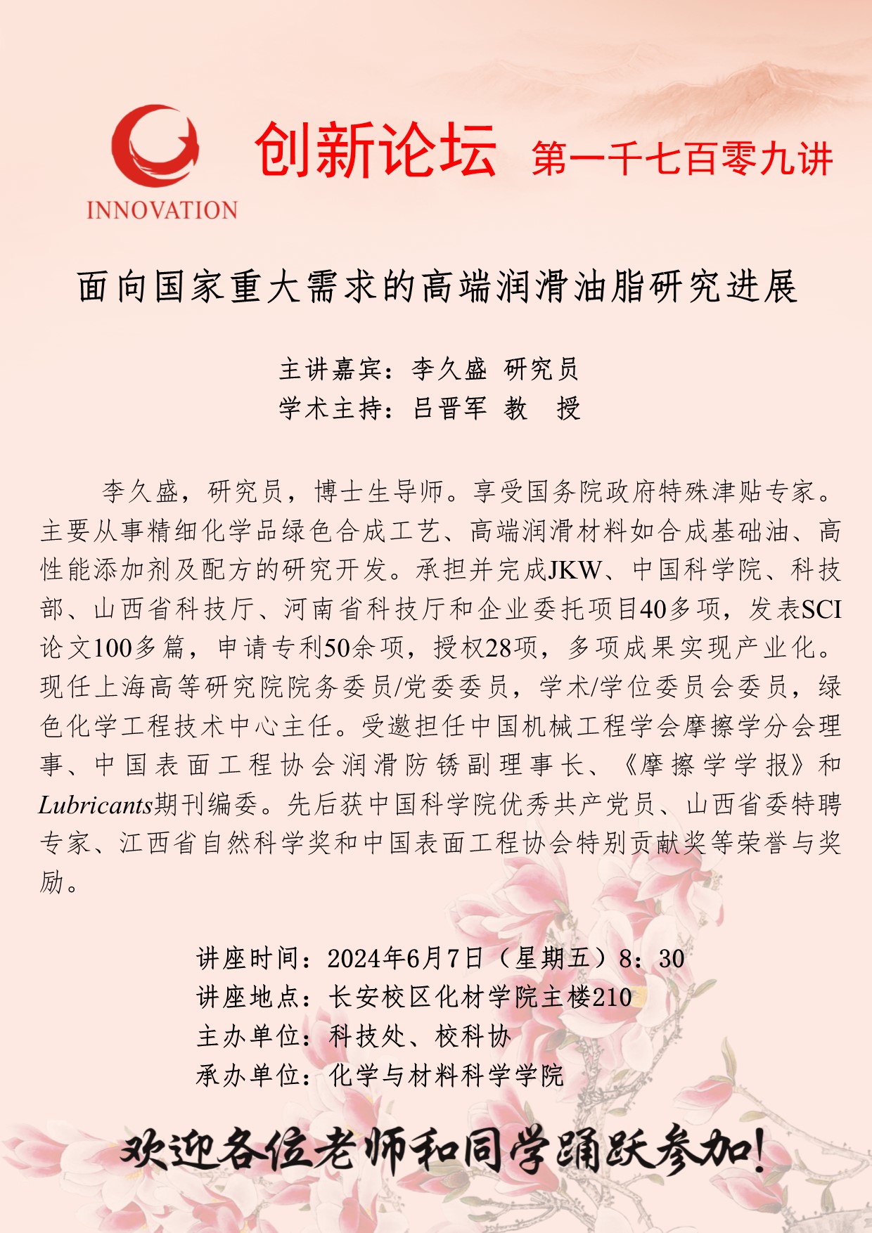 李久盛 研究员 BB平台创新论坛第一千七百零九讲:面向国家重大需求的高端润滑油脂研究进展 讲座时间 2024年6月7日(星期五)8:30 讲座地点 长安校区化材学院主楼210 讲座人介绍 李久盛 研究员 讲座内容