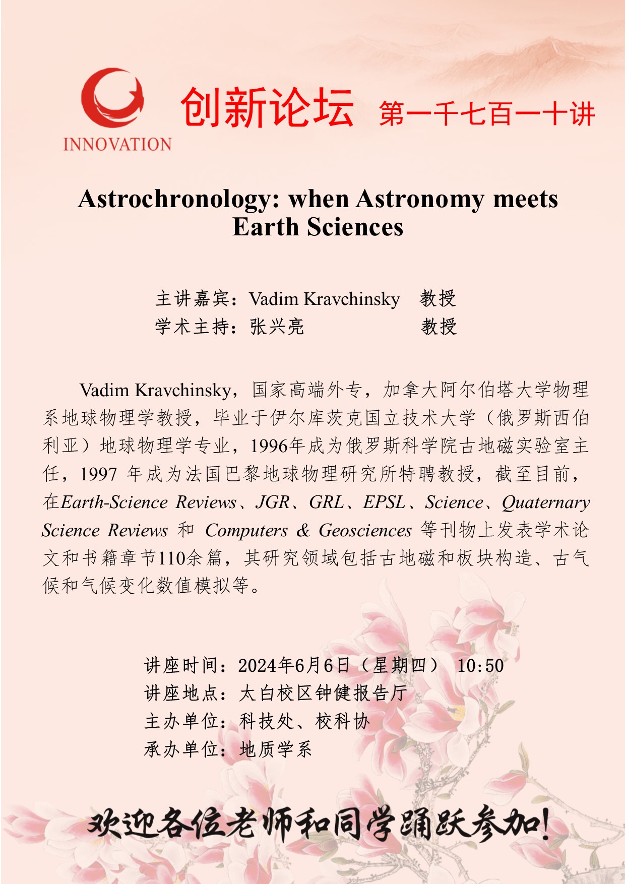Vadim Kravchinsky 教授 BB平台创新论坛第一千七百一十讲:Astrochronology: when Astronomy meets Earth Sciences 讲座时间 2024年6月6日(星期四) 10:50 讲座地点 太白校区钟健报告厅 讲座人介绍 Vadim Kravchinsky 教授 讲座内容