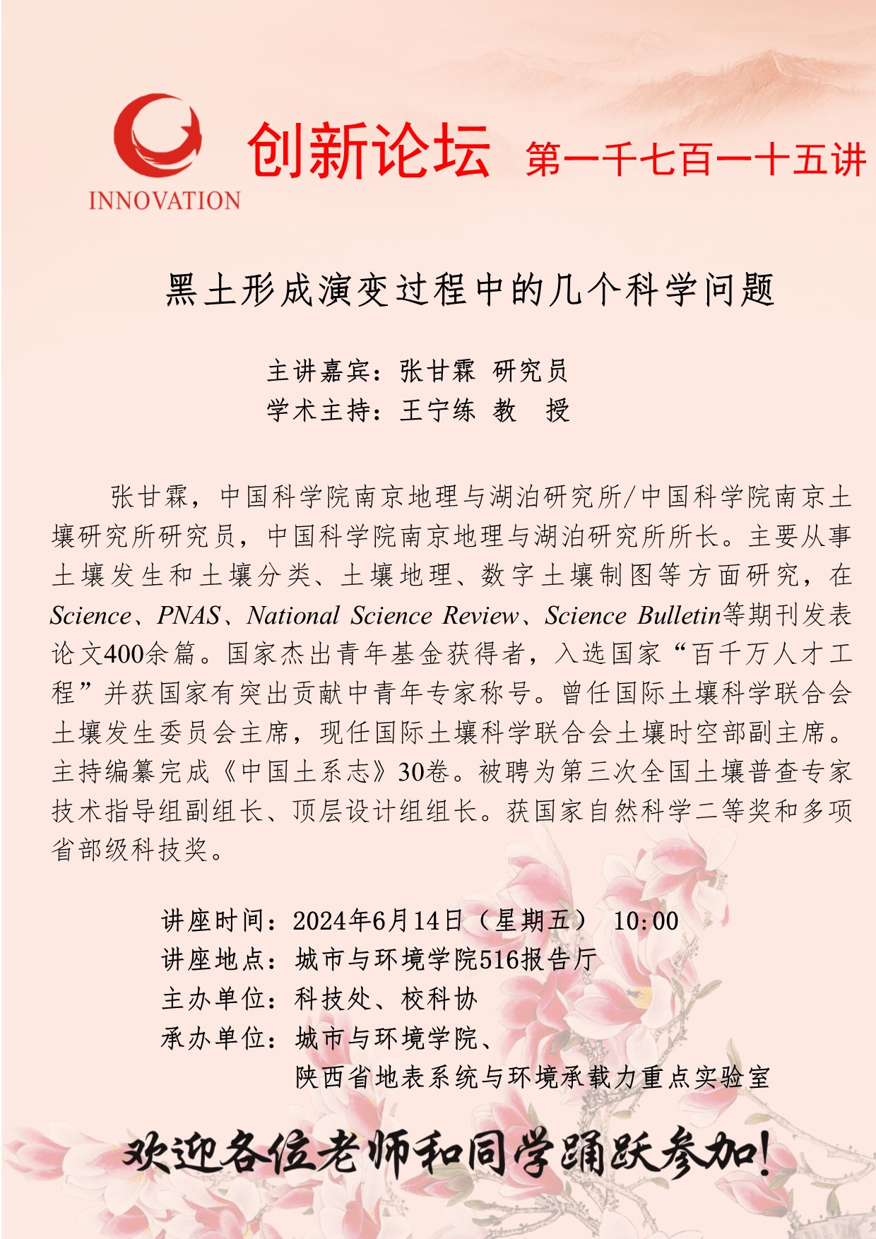 张甘霖 研究员 BB平台创新论坛第一千七百一十五讲:黑土形成演变过程中的几个科学问题 讲座时间 2024年6月14日(星期五) 10:00 讲座地点 城市与环境学院516报告厅 讲座人介绍 张甘霖 研究员 讲座内容